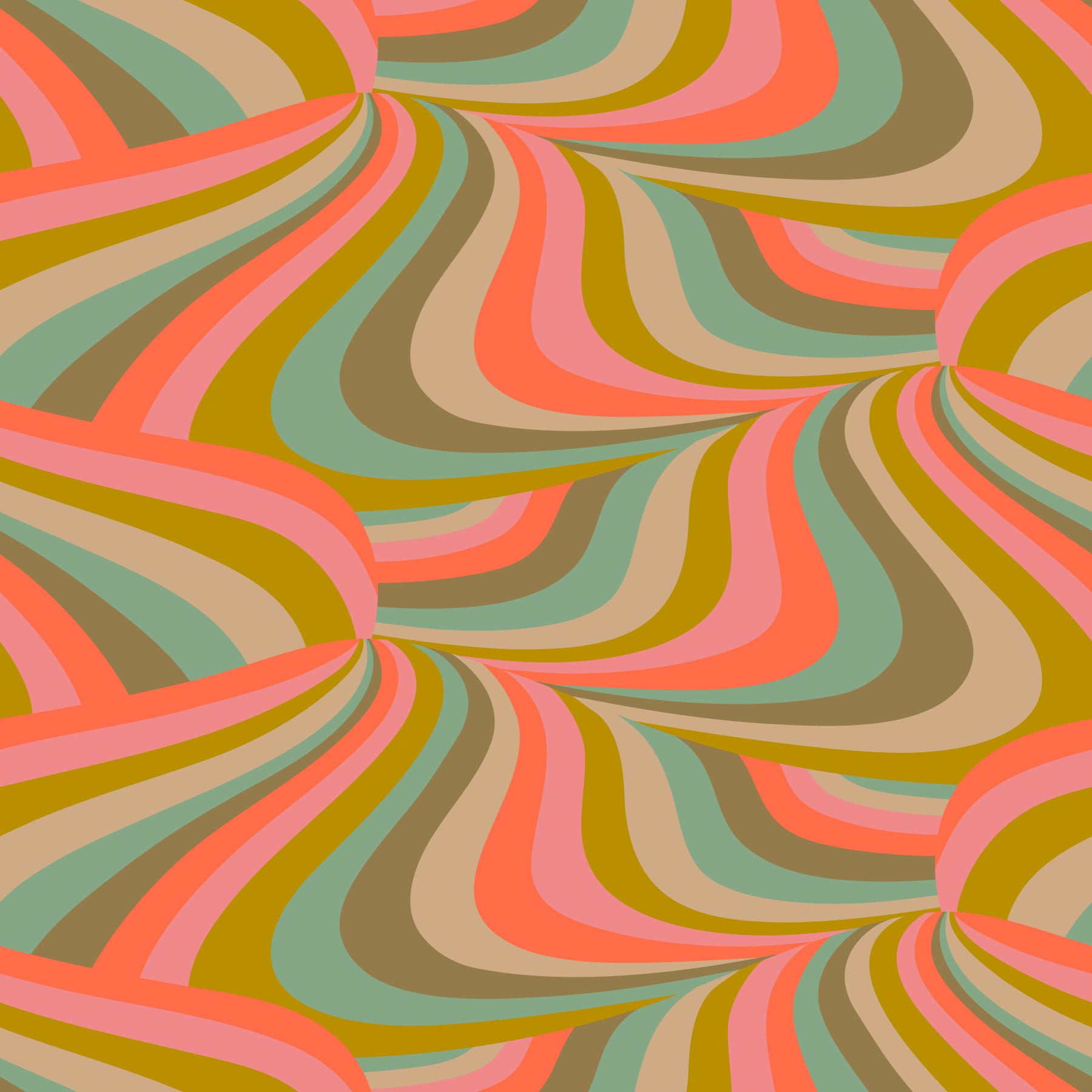 Retro mod groovy swirling marble stripes in a warm bright colour combo of Pink, Mint Green, Mustard Yellow, Coral Orange, Cream and Light Brown! This pattern design is also available in Other Colourways too! Original wallpaper pattern design by Jackie Tahara of UnBlink Studio.