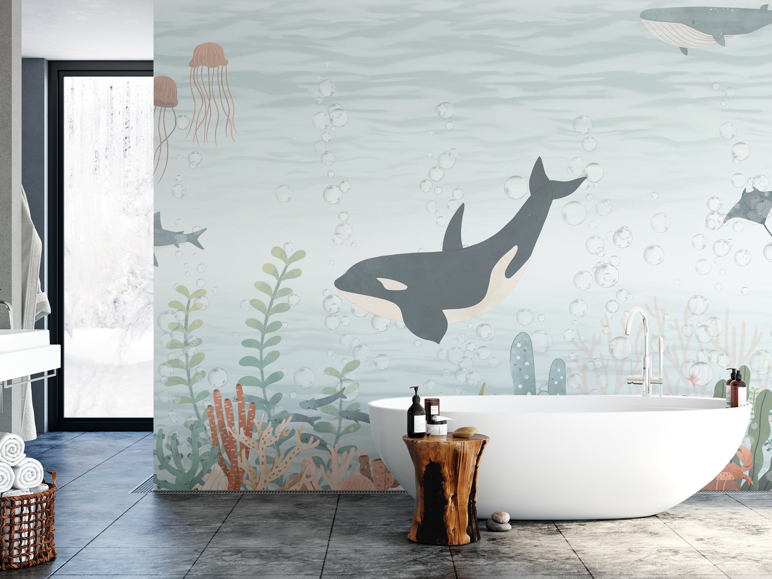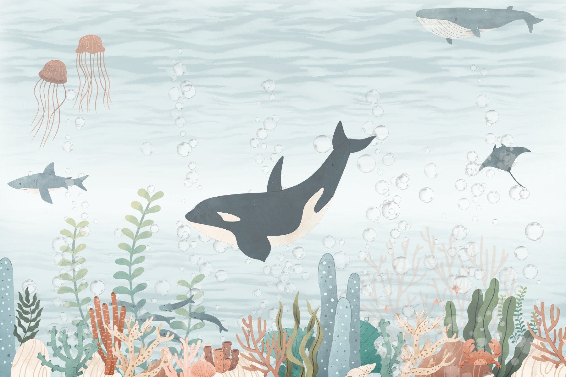 Dive into the enchanting depths with the marine ballet wallpaper mural, where the ocean's majestic creatures perform a silent symphony. This ocean wallpaper captures the grace of whales in a delicate underwater waltz, perfect for a child's room where imagination swims with the tides. Each brush stroke of this whale wallpaper tells a story of gentle giants gliding through a sea of bubbles and coral, creating a soothing underwater tableau. It's a piece that offers a window into the vast blue, inviting young minds to dream and explore the mysteries of the deep. The marine ballet wallpaper mural isn't just decor it's an invitation to wonder, a nautical narrative that enchants with every view, turning a simple room into a sea of adventure.