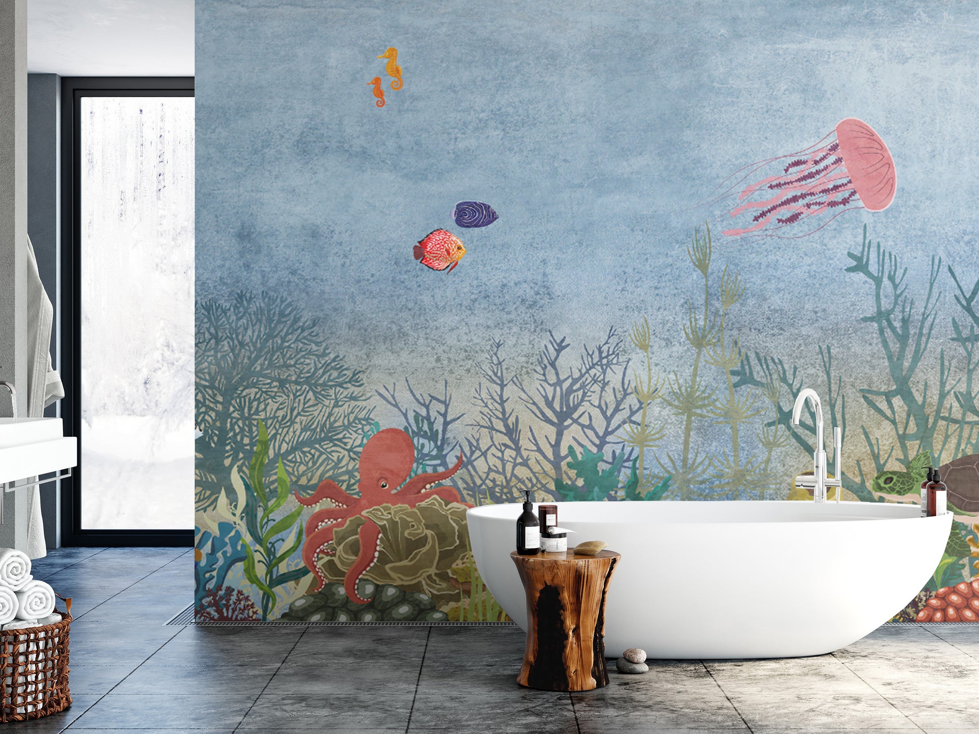Bring a breathtaking ocean scene into your home with the Marine Life Underwater Wallpaper Mural for walls. Featuring bright fish, an adorable octopus, and a tranquil turtle swimming in a kaleidoscope of corals, this mural is a wonderful representation of an oceanic atmosphere. Be a lover of marine life or an admirer of nature's beauty- this mural will breathe life into your living room or bedroom. Shop now and enjoy the soothing effect of ocean views in your home with free shipping!