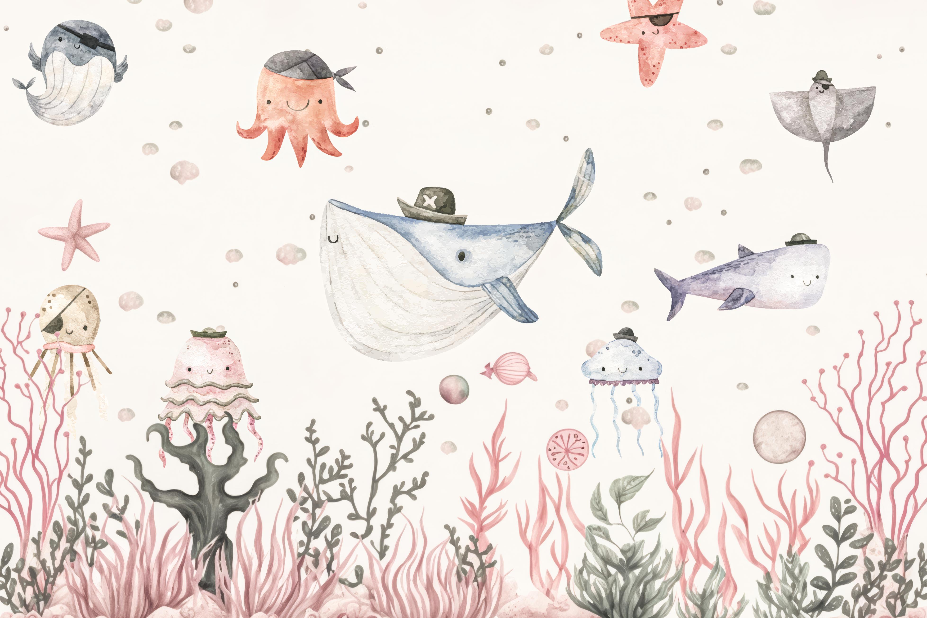 Brighten the nursery with our nursery wallpaper for the maritime mischief aquarium mural! This joyful mural invites your child to a world of smiling pirate fish, dapper whales, and stylish stingrays. Each sea creature is a friend, beckoning young imaginations to play and explore the depths of the ocean from the comfort of home. It's more than just a scene on the wall, it’s a conversation starter, a playful companion, and a backdrop to childhood adventures. Make a simple change that brings a wave of storytelling and joy to your nursery. Don't just cover walls, inspire your child with a sea of tales!