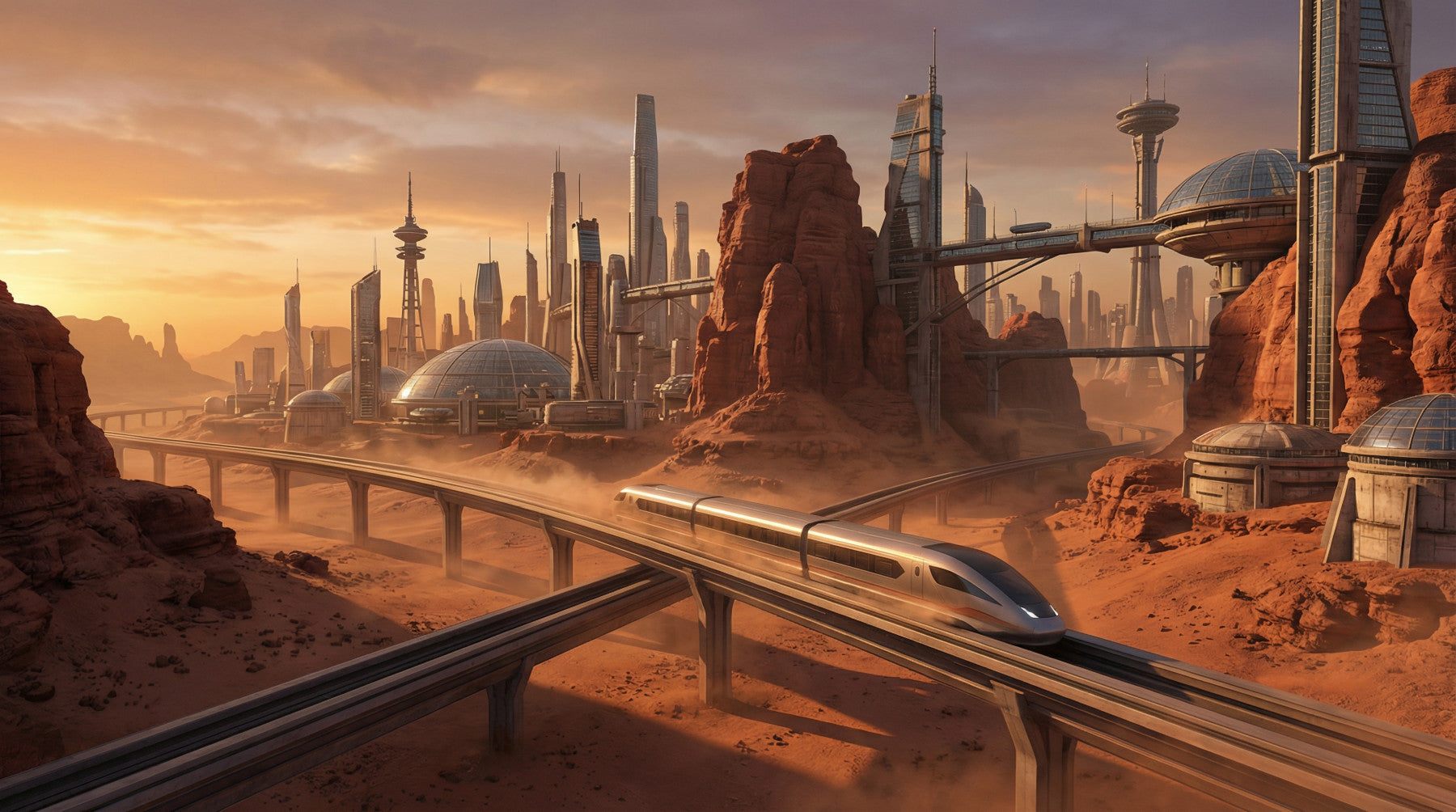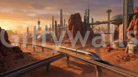 Transform your space with this vision of tomorrow! This wallpaper for walls brings a futuristic cityscape straight to your home, featuring sleek silver trains gliding across terracotta landscapes. Towering buildings and dome structures punctuate the horizon, bathed in a warm, otherworldly glow. The colour palette blends earthy reds and oranges with cool silvers and greys, adding depth and sophistication to any room. Perfect for a home office, living room, or bedroom, this design adds a touch of sci-fi elegance and a modern, expansive feel. It enhances interior spaces with its unique blend of technology and natural formations.