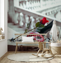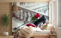 Venetian mask and high heel shoe with red rose, Rialto bridge, Venice, Italy. Elevate the sophistication of your interior spaces with this refined wallpaper for walls. The stylized composition presents a red rose, a classic stiletto, and a crimson mask, invoking intrigue. A dark ribbon adds drama against the backdrop. The muted, almost monochromatic, palette creates a timeless feel. This design integrates seamlessly into a dressing room, bedroom, or a chic hallway, complementing modern and classic aesthetics alike. Install it in a powder room to transform a small space. Consider this luxurious art piece to bring an air of mystery.