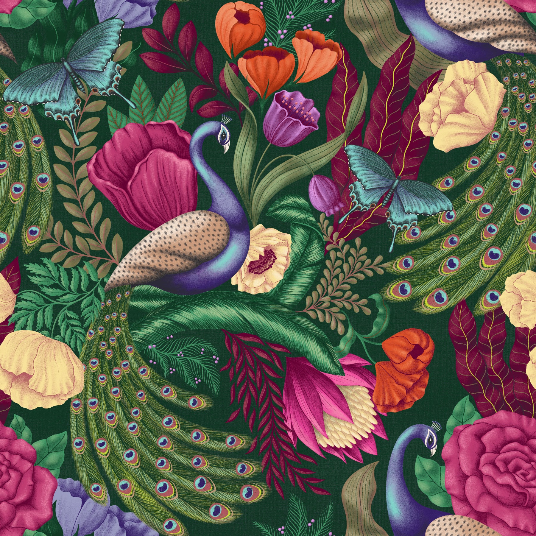 Maximalist Peacock Fantasy Garden - Dark Green Wallpaper offers a rich mix of peacocks, butterflies, florals, and leafy botanical detail in a structured repeat pattern. Set on a deep green background, the design highlights tones of pink, plum, teal, orange, cream, and olive for a look that feels bold, layered, and visually full. The pattern carries well across larger wall surfaces, giving the artwork a smooth continuous flow while keeping each element clear and defined. Feathers, petals, and foliage work together to add texture and depth, making the wallpaper suited to interiors that lean toward decorative, nature-inspired styling. Maximalist Peacock Fantasy Garden - Dark Green Wallpaper also pairs nicely with brass accents, dark timber finishes, velvet fabrics, and neutral furnishings for a balanced maximalist setting.