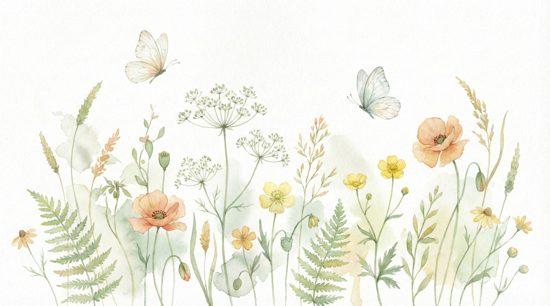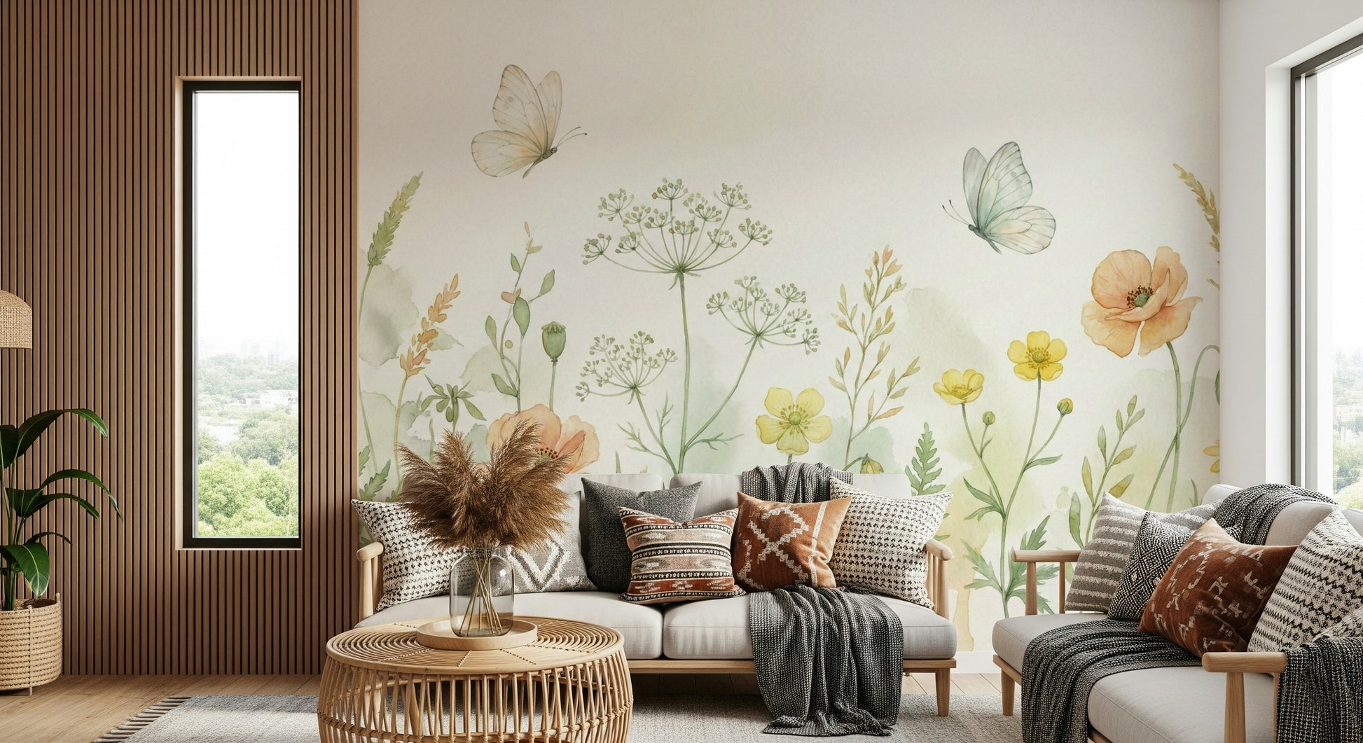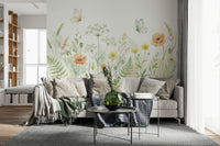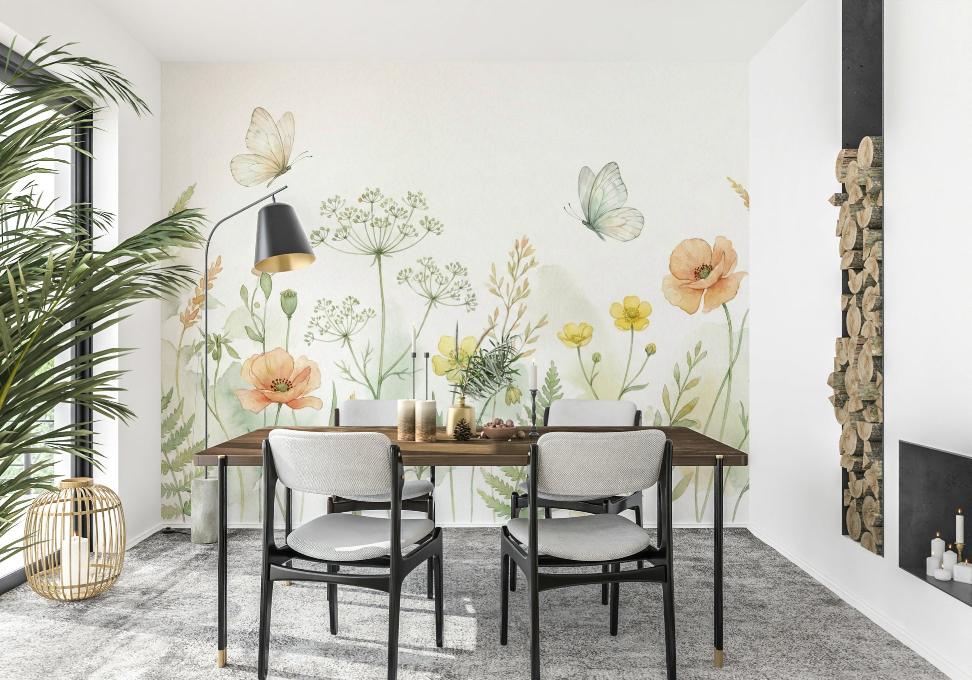 Bring the tranquility of a watercolour meadow into your home with this delicate wallpaper for walls. Featuring gentle hues of green, yellow, and peach, interspersed with butterflies, ferns and wildflowers, this design creates a serene and airy atmosphere. The soft brushstrokes and botanical details add a touch of artistic elegance, perfect for transforming a bedroom into a restful retreat or enhancing the calming ambience of a living room. Complement minimalist decor or add subtle colour to a neutral space. This wallpaper makes any interior feel lighter and more inviting.