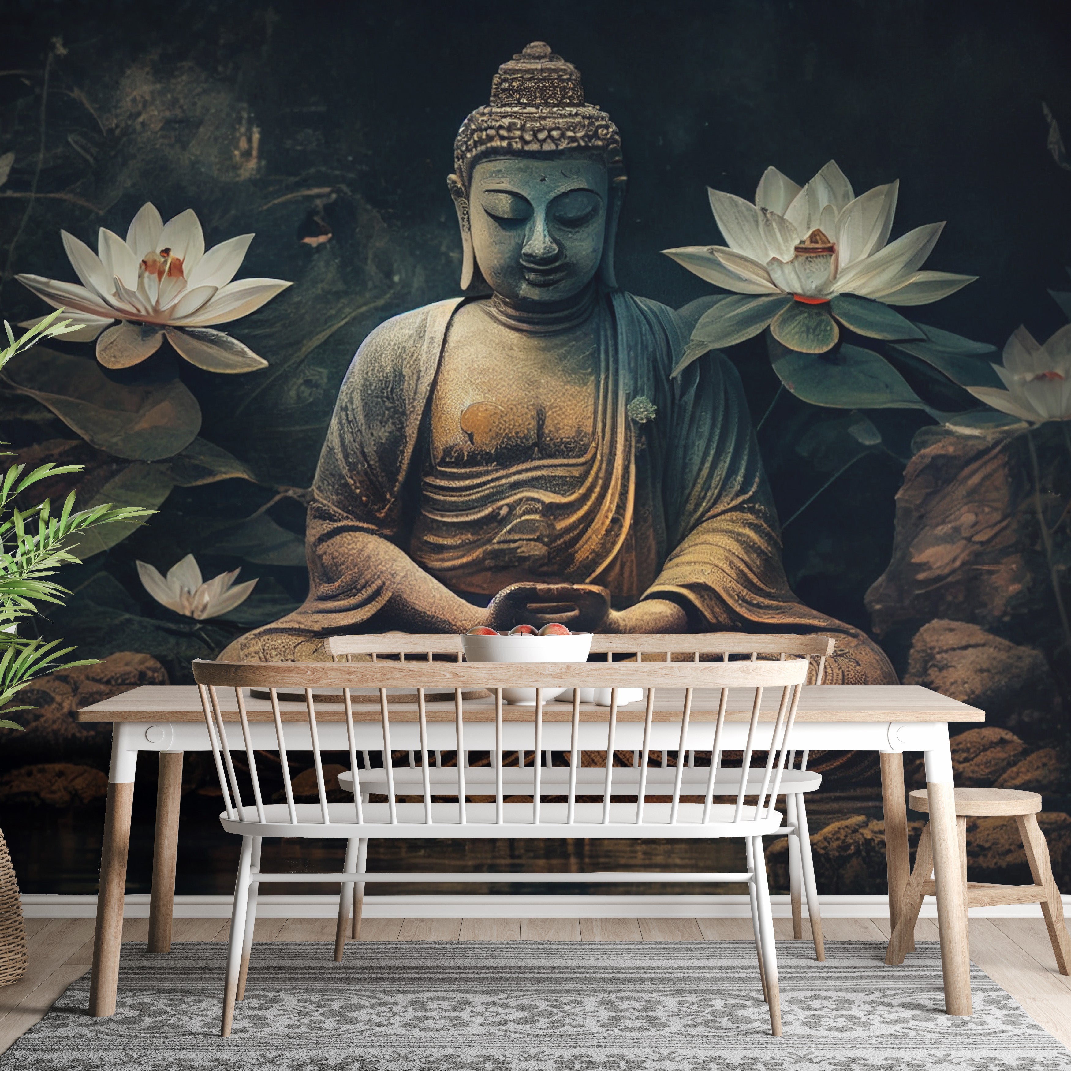 Introduce a serene and mindful atmosphere to your living space with the meditative buddha with lotus flowers mural. This flower wallpaper mural features a peaceful Buddha amidst a bloom of lotus flowers, symbolizing purity and enlightenment. The vibrant colors and detailed design make it an eye-catching addition to any living room wallpaper collection. Ideal for creating a calming and thoughtful environment, this mural serves as a gentle reminder of tranquillity and inner peace. Its elegant portrayal of the Buddha amidst nature's beauty makes it a perfect choice for those seeking a harmonious and inspiring backdrop in their home.