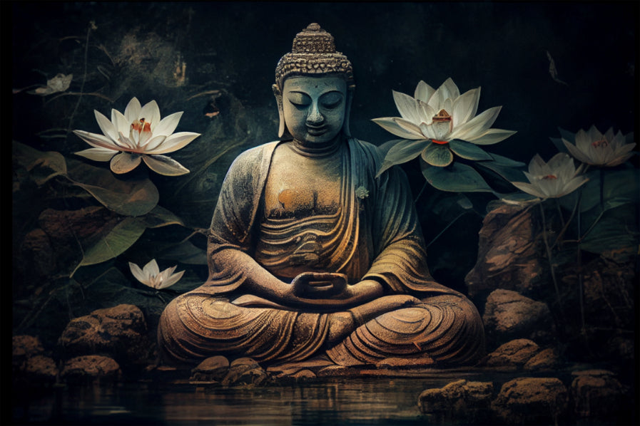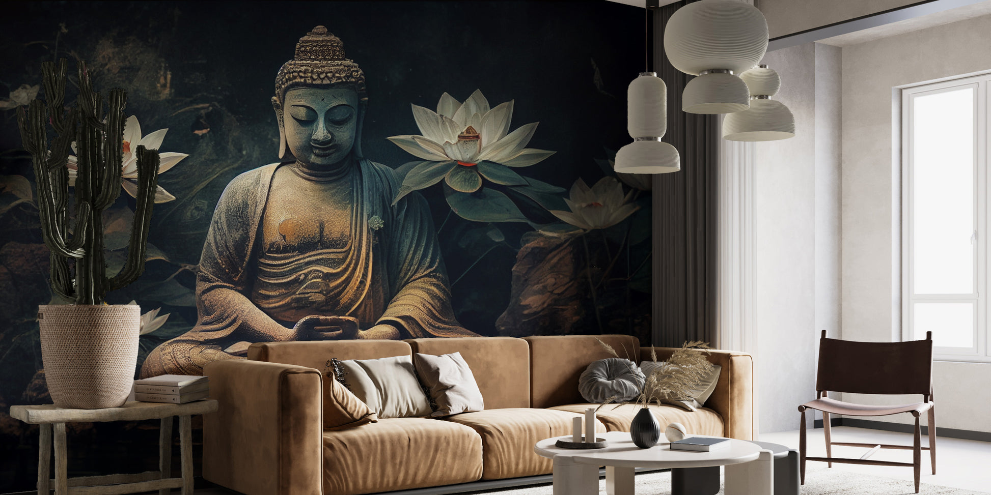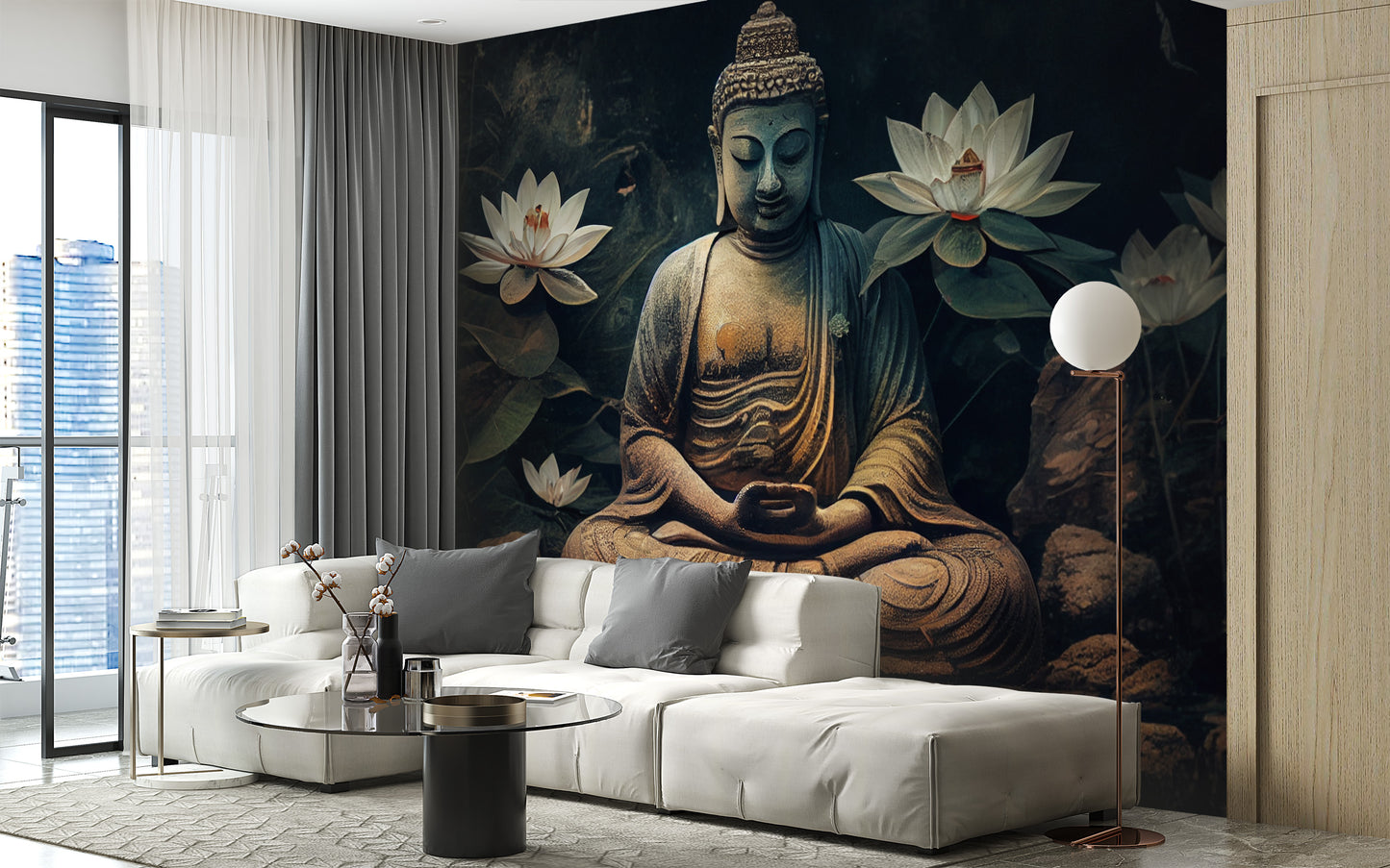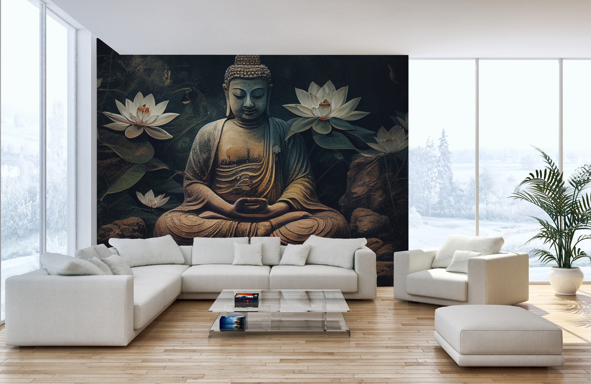 Meditative Buddha and Lotus Flowers Mural - Giffywalls