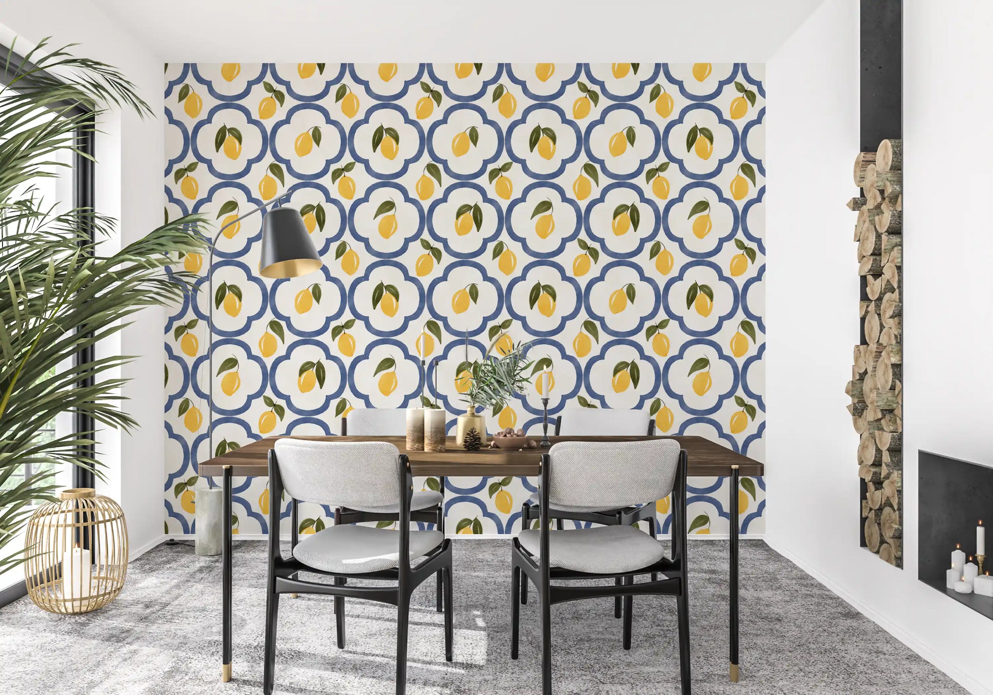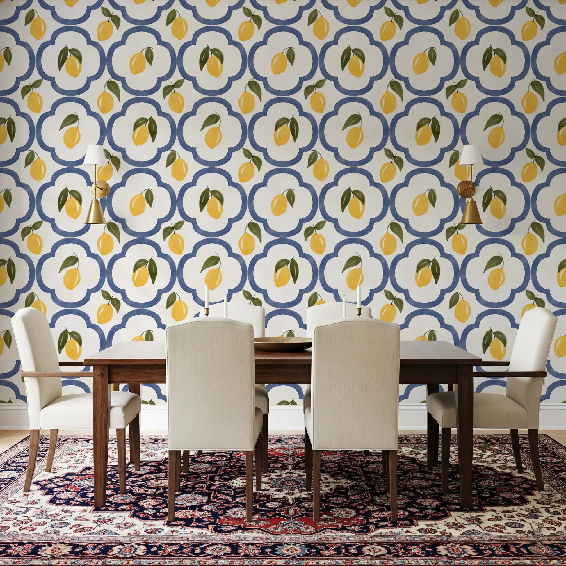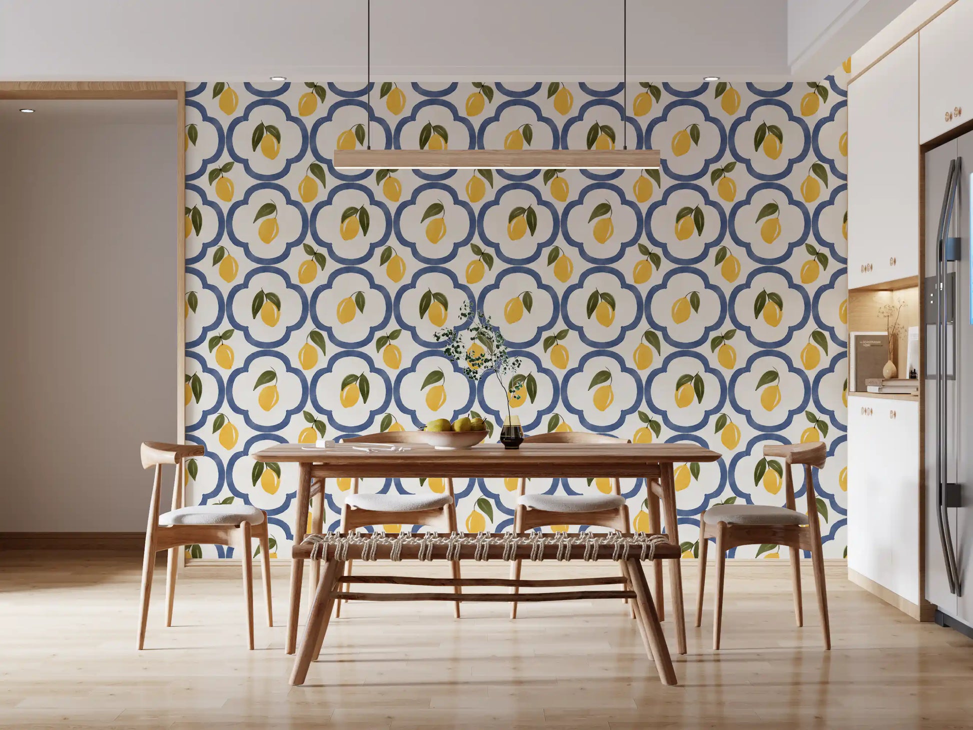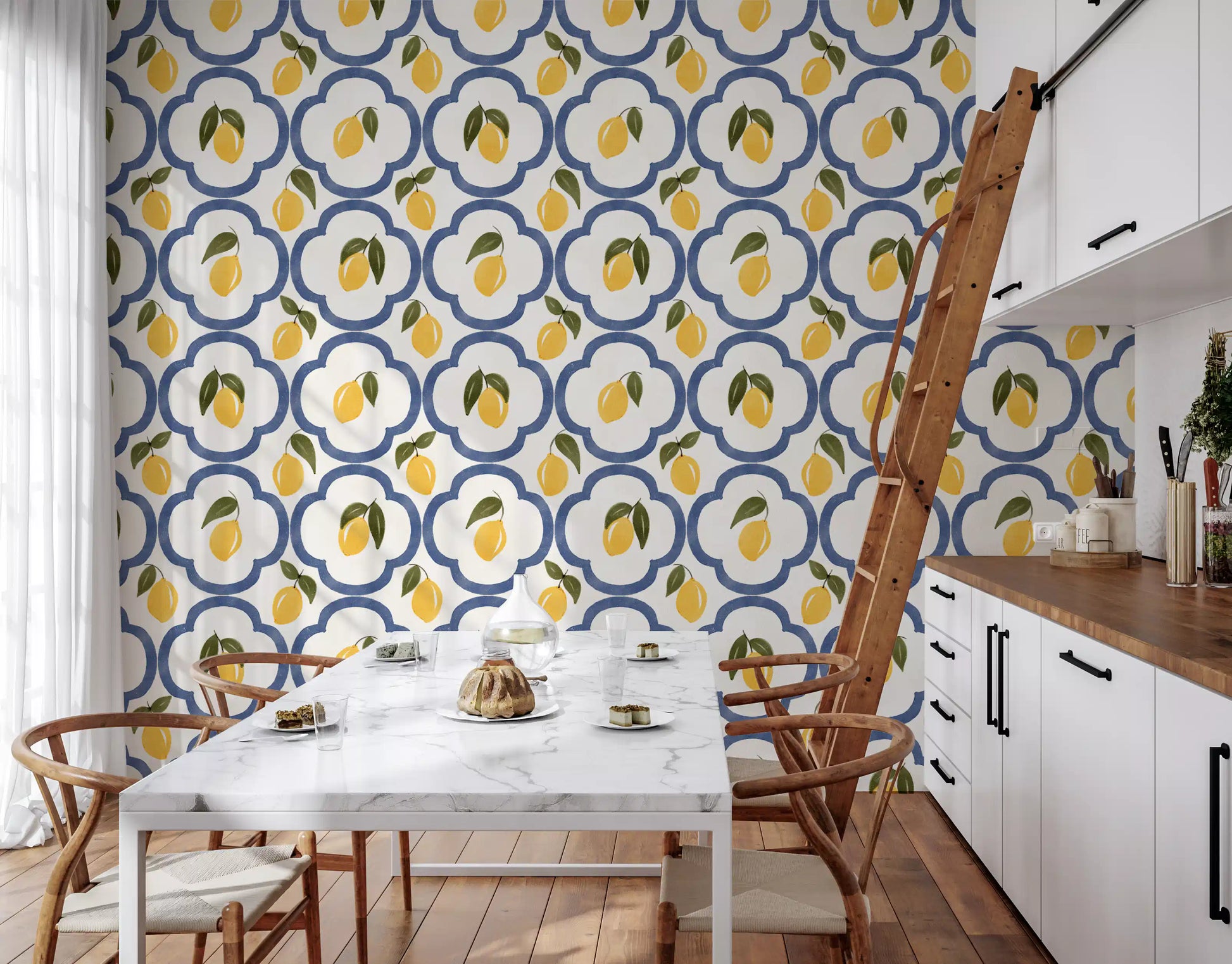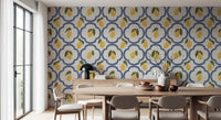 Transform your living space into a sun-drenched Mediterranean escape with this enchanting lemon decor. This vibrant wall covering features a delightful pattern of zesty yellow lemons, complete with fresh green leaves, set against a crisp, creamy white background. Each luscious fruit is nestled within an elegant, deep blue quatrefoil-inspired motif, reminiscent of classic Mediterranean tiles. The hand-painted, watercolor-like texture adds an artisanal charm and depth, bringing a subtle, rustic sophistication to any room. Imagine the cheerful glow these radiant lemons will cast, creating an atmosphere of warmth, freshness, and timeless coastal beauty. Perfect for kitchens, dining areas, or any space desiring a touch of southern European charm, this design infuses your home with the joyful spirit of summer. Let the vibrant colors and organic shapes whisk you away to an idyllic orchard under the azure sky, enhancing your decor with a refreshingly bright and inviting aesthetic.