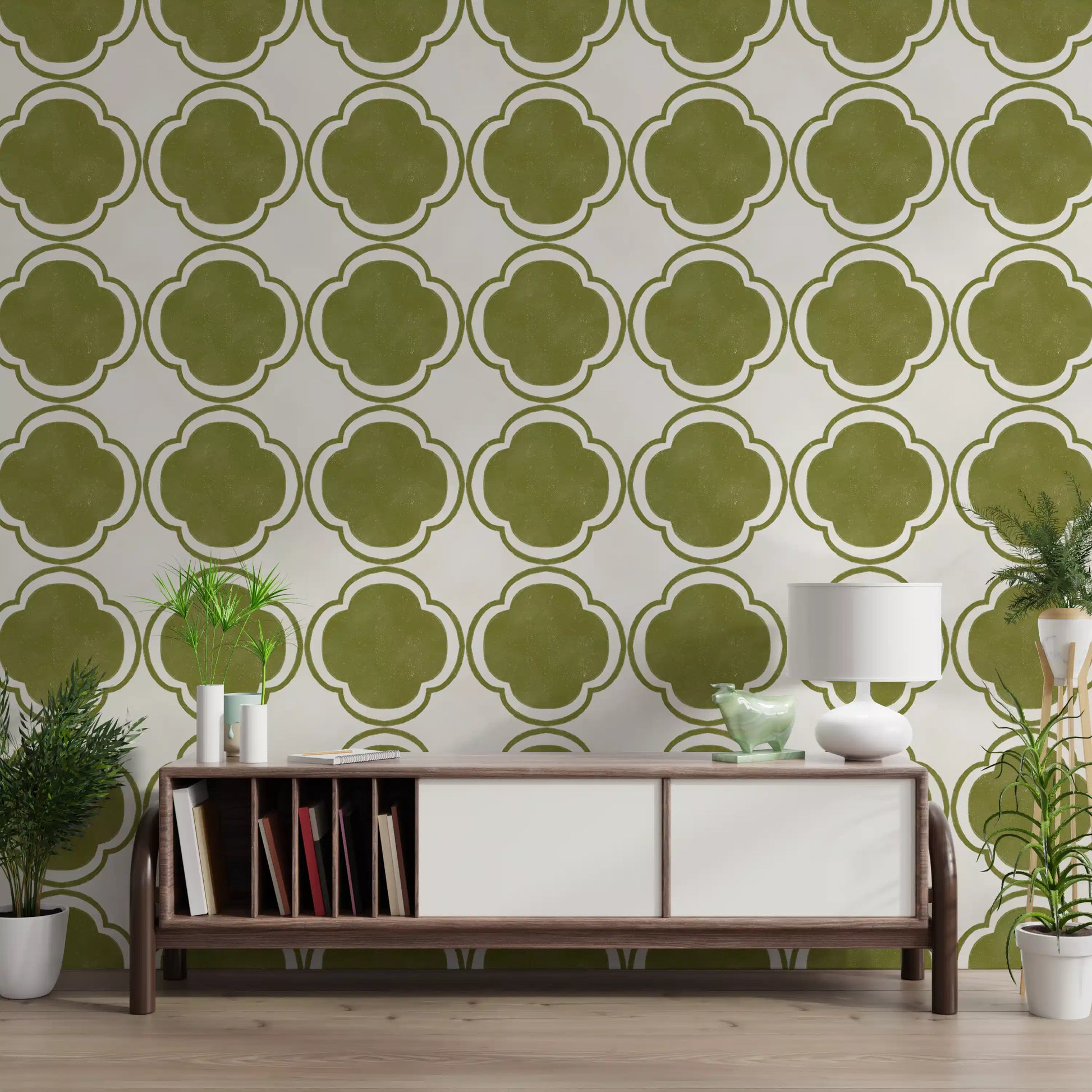 Immerse your space in the serene charm of our Mediterranean Quatrefoil Decor in Green. This exquisite wall covering showcases a timeless quatrefoil pattern, seamlessly blending classic sophistication with organic tranquility. Each four-lobed motif is presented in a rich, earthy olive-green, evoking the lush ancient olive groves and sun-drenched landscapes of the Mediterranean coast. The soothing green hue beautifully contrasts with a soft, off-white background, creating a harmonious and refreshing balance. A subtle, delicate texture permeates the design, adding an authentic, artisanal touch reminiscent of hand-painted tiles or traditional plasterwork. This intricate detailing provides a tactile depth, enhancing the pattern's inviting aesthetic and rustic allure. Perfect for transforming any interior, this decor offers a sophisticated backdrop that inspires calm and enduring beauty.