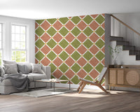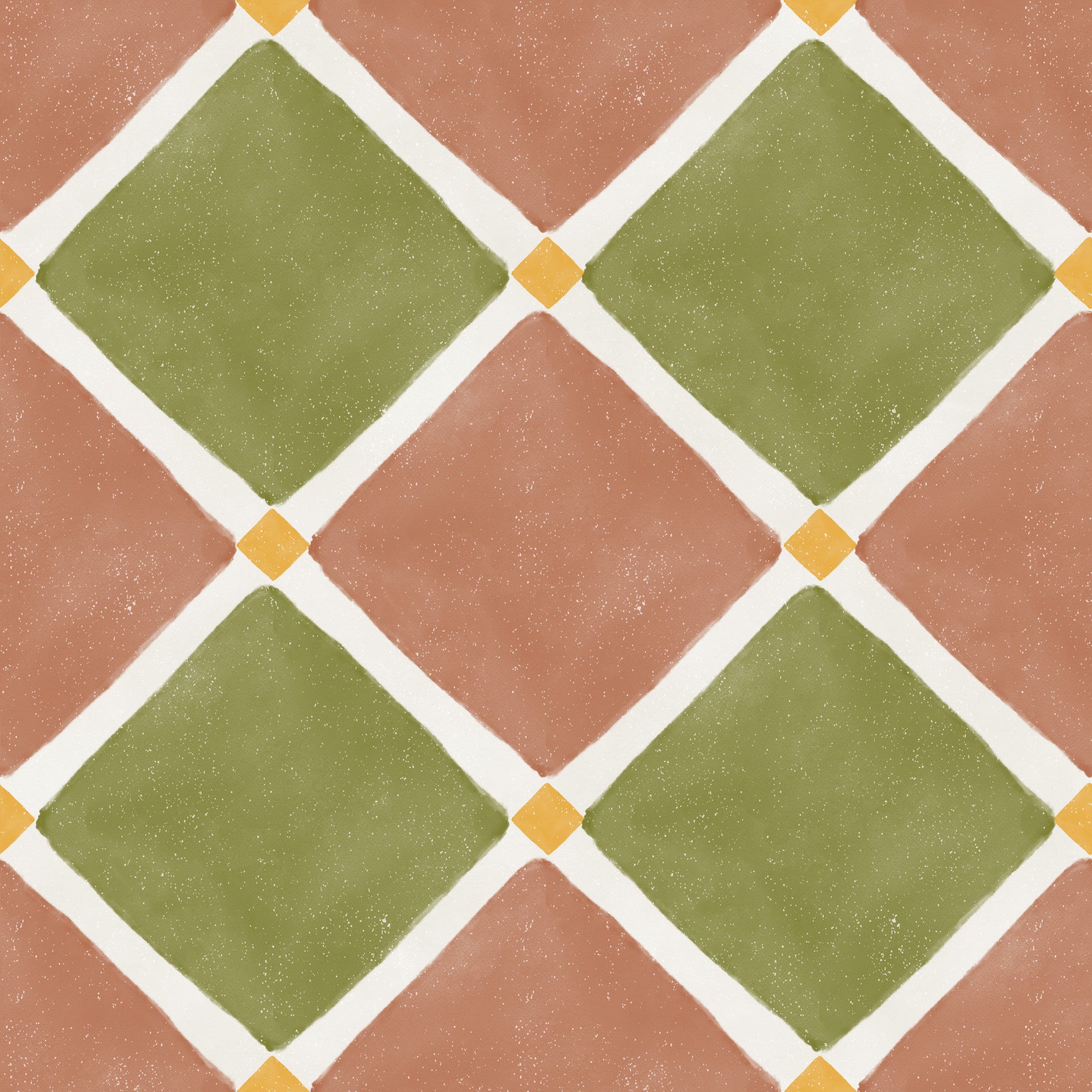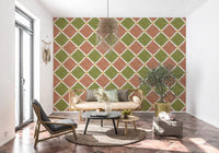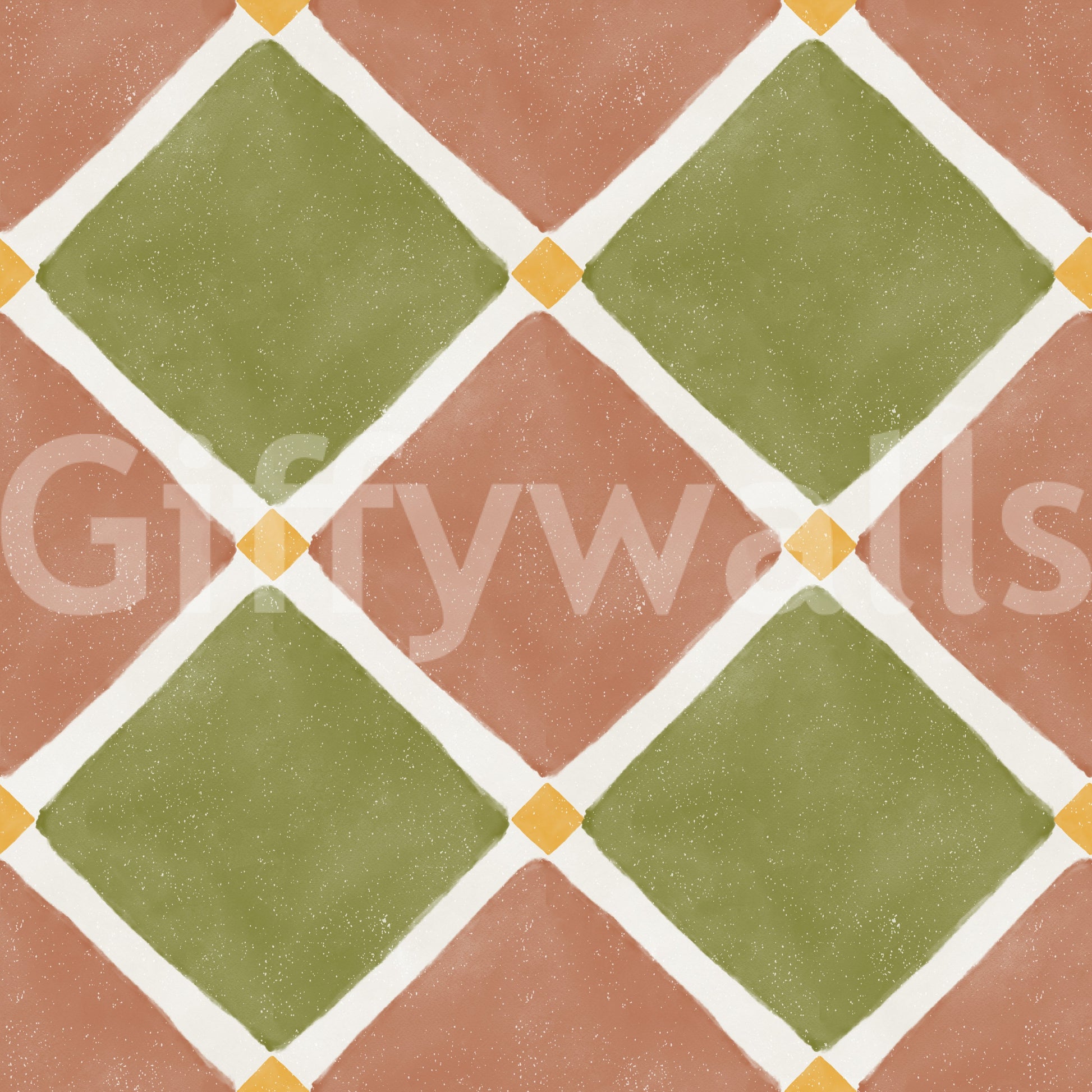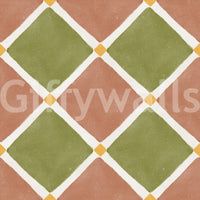 Immerse your space in the sun-drenched charm of the Mediterranean with this exquisite wallpaper. Featuring a rustic checkerboard pattern, each diamond-shaped tile showcases an inviting blend of warm terracotta and serene olive green. The design is artfully aged, presenting a beautiful, weathered appearance reminiscent of centuries-old European décor. Delicate creamy white lines elegantly separate the vibrant hues, while subtle golden yellow accents add a touch of sunny brilliance at every intersection. This unique wall covering embodies the tranquil spirit of coastal villas and countryside escapes. Its textured finish and earthy palette create a sophisticated yet welcoming ambiance, perfect for transforming any room into a haven of timeless style. Embrace the enduring beauty and relaxed elegance of Mediterranean living right on your walls.