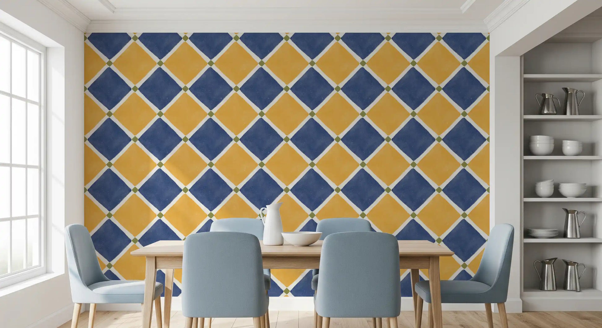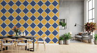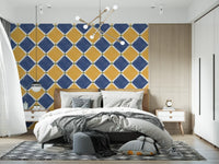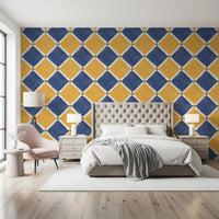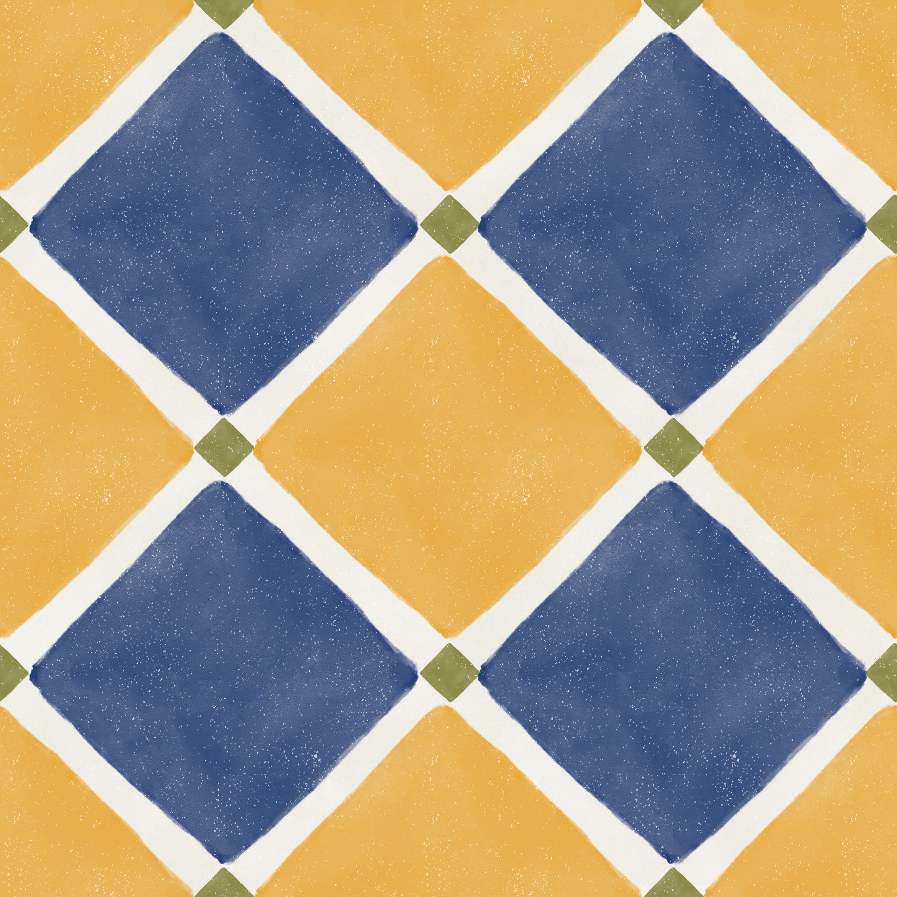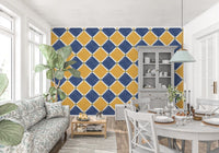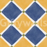 Immerse your space in the sun-kissed charm of the Mediterranean with this rustic checkerboard wall décor. Capturing the timeless allure of aged tilework, this design features an inviting interplay of warm, earthy yellow and deep, serene blue diamond shapes. Each richly colored diamond is gracefully outlined by crisp white lines, leading to subtle yet striking olive green accents at every intersection. The intentionally aged finish, complete with charming speckles and a slightly worn texture, evokes a sense of history and hand-crafted authenticity. Perfect for transforming any room into a haven of warmth and character, this pattern brings the relaxed, sophisticated ambiance of a coastal villa to your home. Create an accent wall or adorn an entire space with this evocative design, inviting a unique blend of vintage elegance and sun-drenched tranquility. It’s more than just a pattern; it’s a journey to an idyllic, timeless escape.