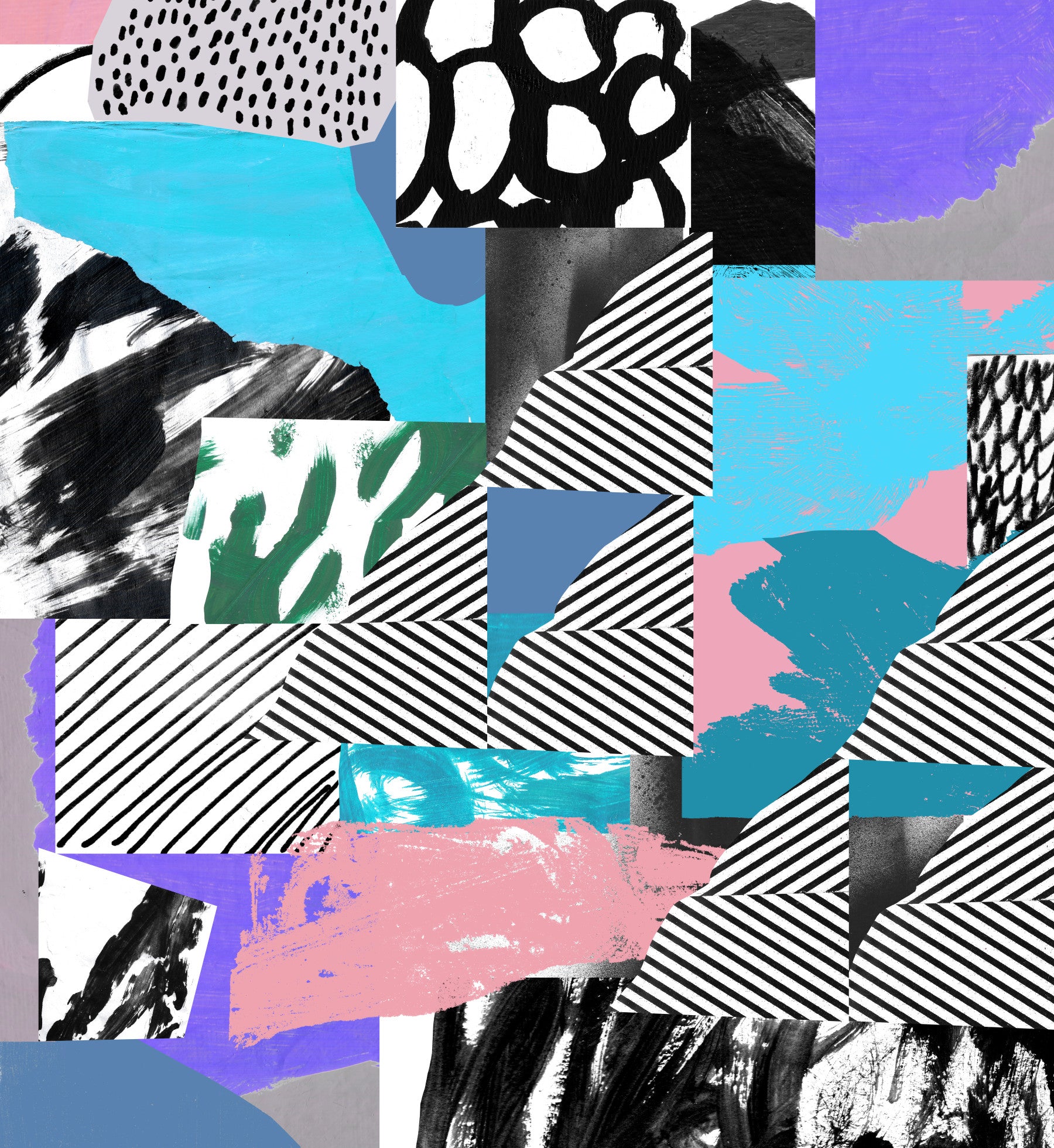 A bold party-inspired wallpaper with overlapping colorful elements and quirky graphic textures.