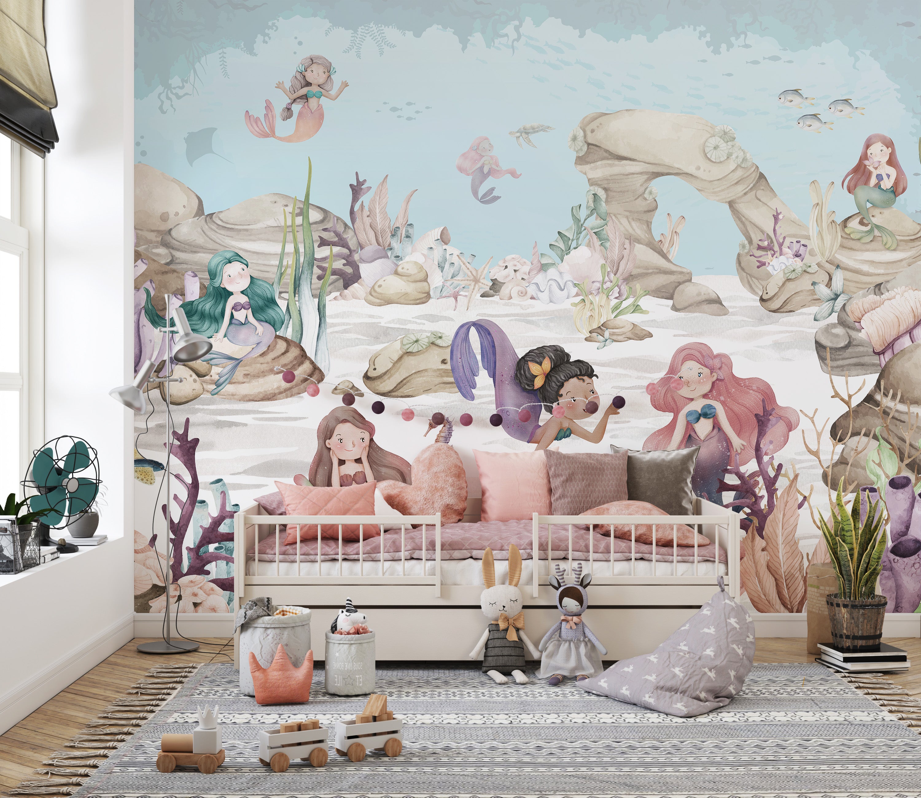 Bring the beauty and mystery of the ocean into your girl's room with the mermaid miracles girls room mural. This enchanting mural features adorable mermaids, colourful corals, and an array of sea creatures, creating a vibrant underwater life wallpaper that will captivate your child's imagination. The mural's detailed artwork and lively colours make it an excellent choice for any girl's room, providing a magical backdrop for play and creativity. From the gentle waves to the playful mermaids, every element is designed to inspire and delight. The Mermaid Miracles mural is more than just a wall covering; it's an invitation to explore a world of wonder.