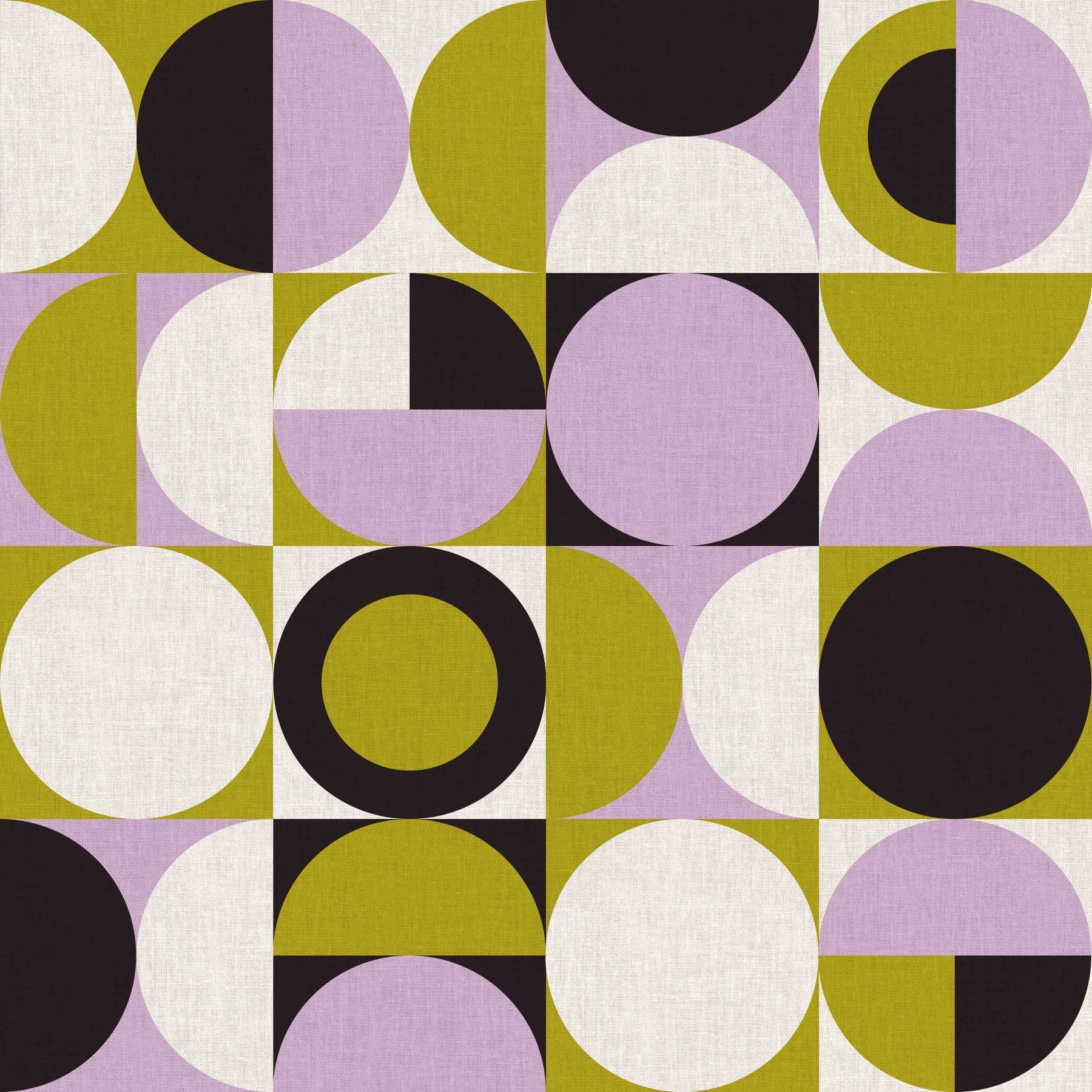 "Mescolanza," an Italian word for mixture, perfectly captures the spirit of this vibrant wallpaper. A playful collision of geometric forms – circles and squares – dance across a textured canvas. The harmonious blend of olive green, soft lilac, clean white, and bold black creates a captivating visual rhythm. This design evokes a sense of mid-century modern charm with a contemporary twist, making it a stunning addition to any space. The balanced asymmetry and delightful color palette ensure a focal point that is both eye-catching and subtly sophisticated, bringing a fresh and artistic feel to your screens.