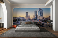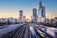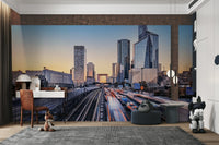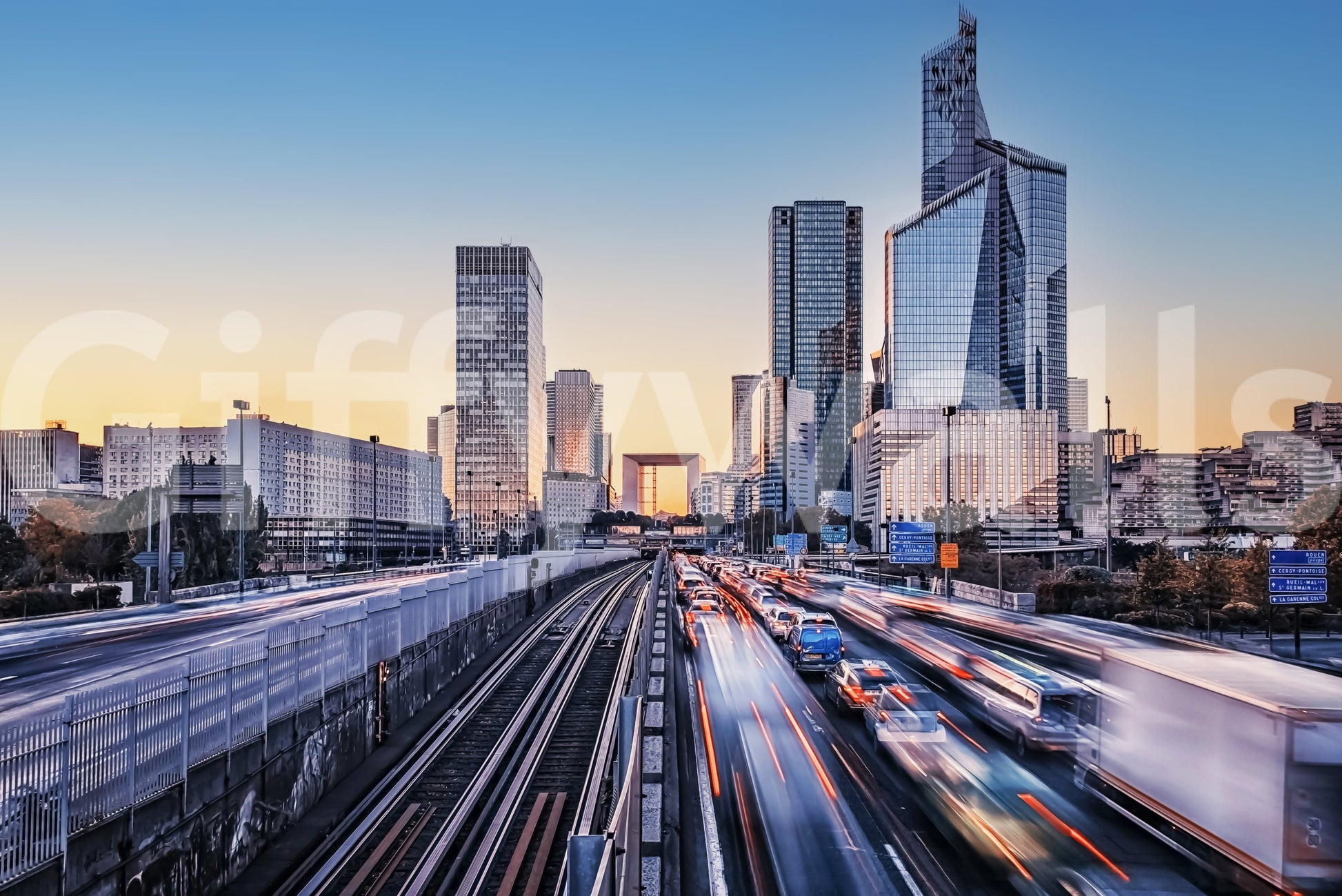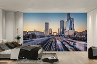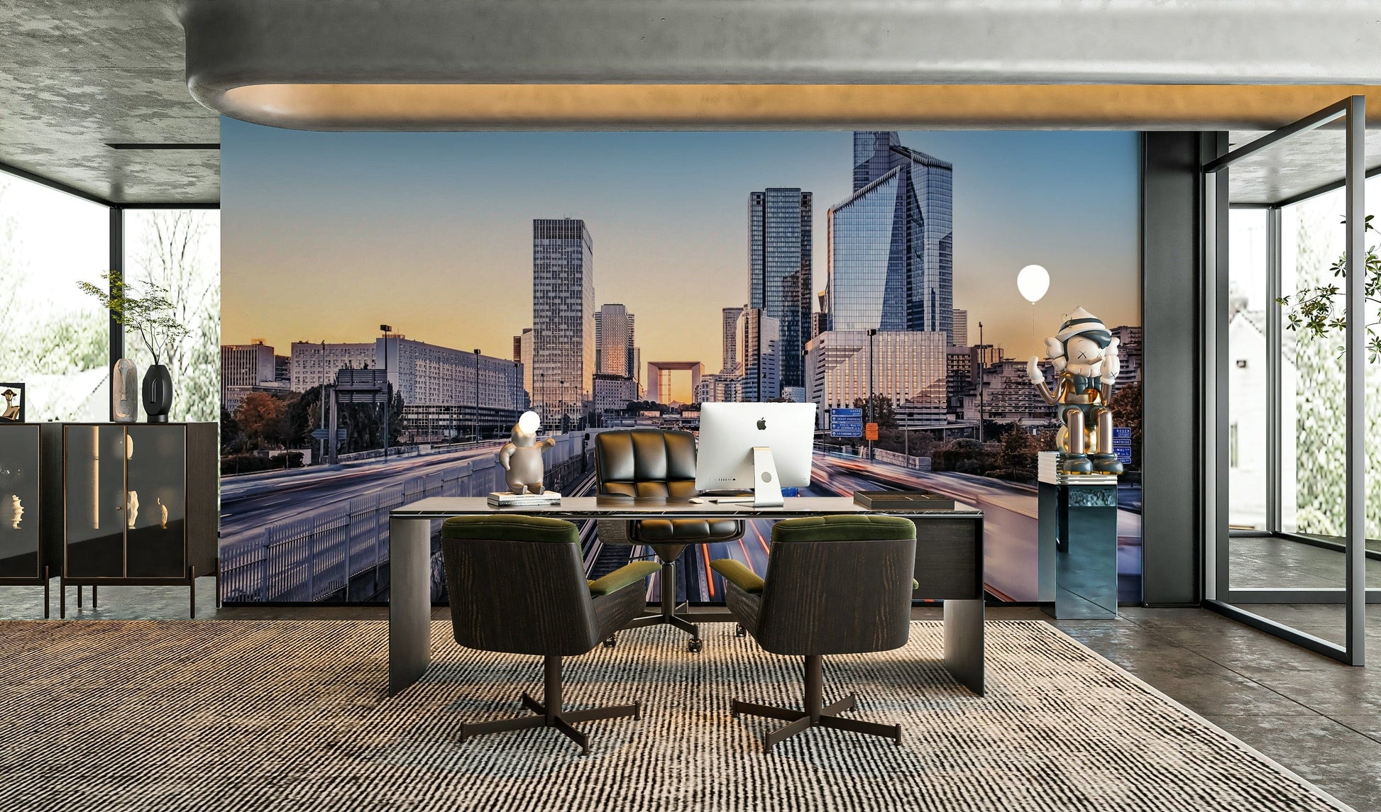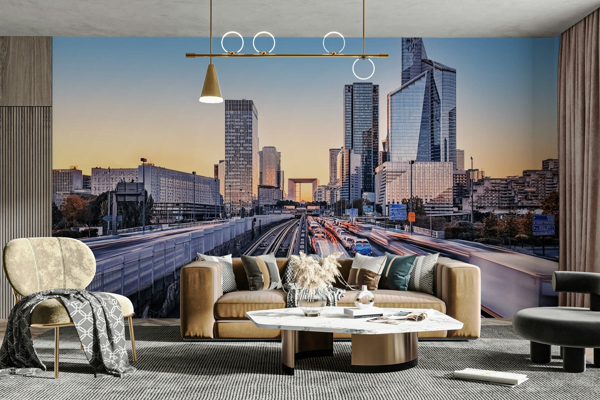 Transform a room with this vivid city wallpaper for walls. The image presents a breathtaking view of Paris at dawn with high-rise buildings and motion blurred city traffic. It blends cool blues with soft oranges. This design suits a modern living room, dining room, or office. It injects a lively and stylish urban vibe and delivers a sense of sophistication to the interior space.