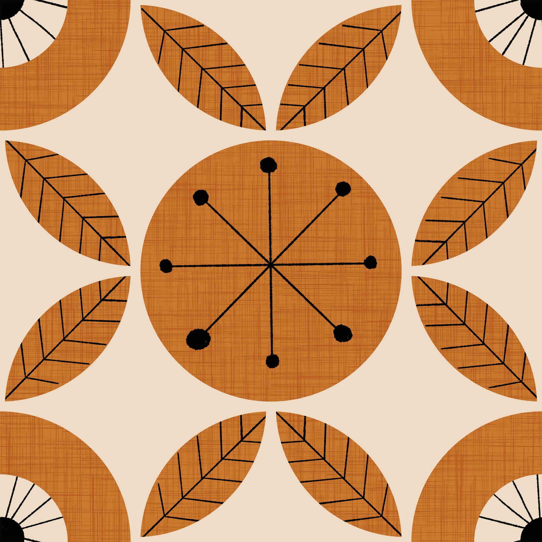 Retro charm wallpaper with repeating orange circular graphics and neatly arranged leaf shapes.