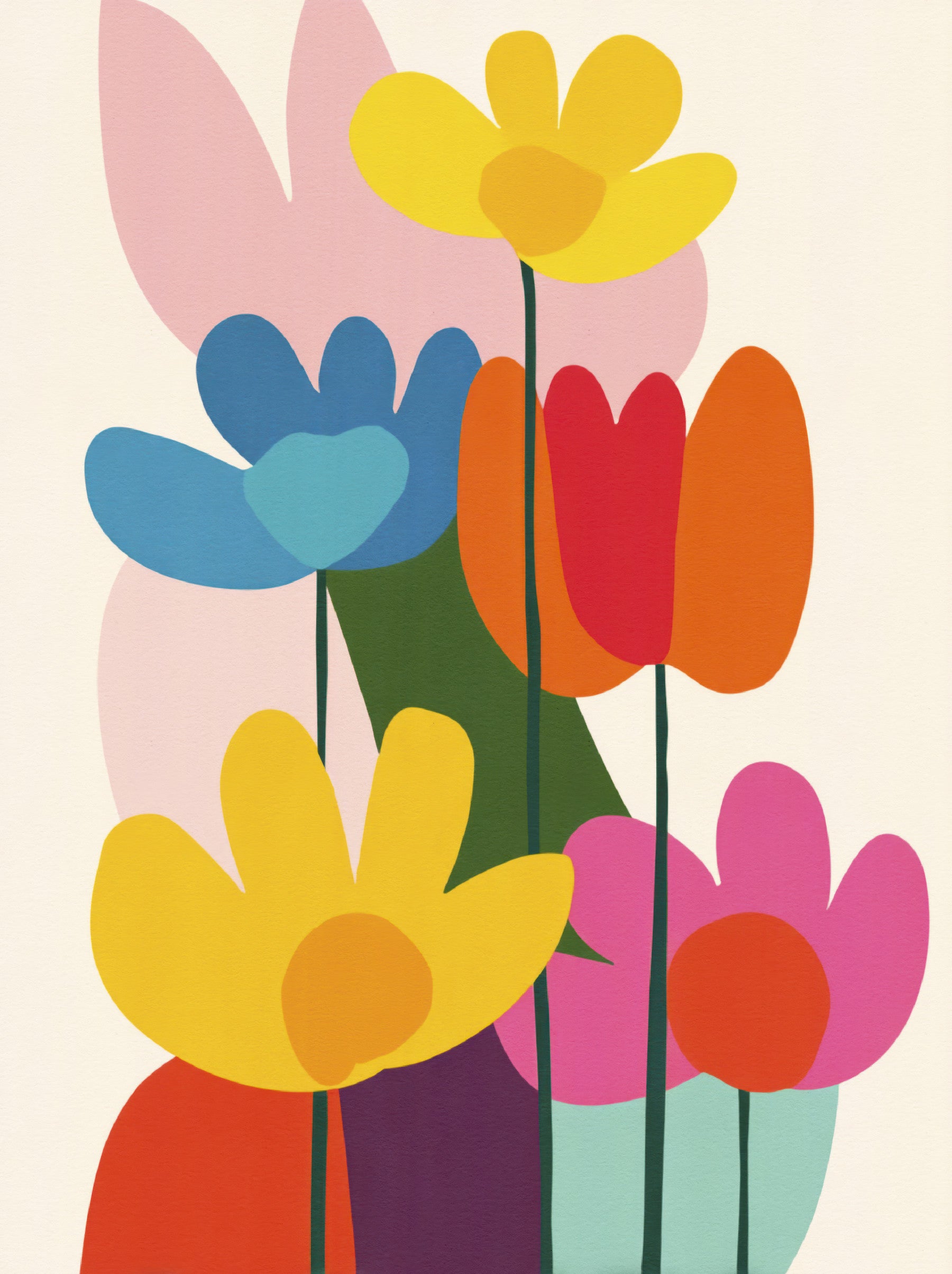 This striking wallpaper features bold, simplified floral shapes in a vibrant mid-century modern style. The design is characterized by a mix of geometric and organic forms, creating a retro aesthetic that is both playful and sophisticated. The rich color palette and dynamic composition would make it a statement piece in a living room, hallway, or even a bedroom. This image would add a bold splash to any space, creating a sense of playful sophistication.