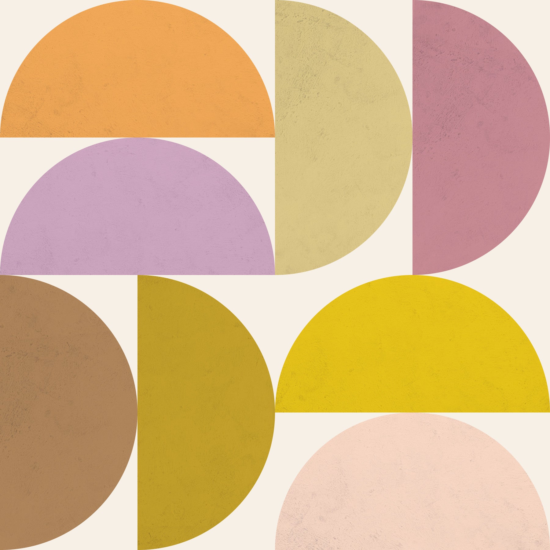 This wallpaper design evokes a sense of calm sophistication with its mid-century modern aesthetic. The image features a harmonious arrangement of semi-circles in muted earth tones, creating a balanced and visually appealing composition. The subtle textural effect adds depth and warmth, making it suitable for a variety of spaces, from living rooms and bedrooms to offices seeking a tranquil atmosphere. Its understated elegance and versatile color palette effortlessly blend with existing décor, offering a serene backdrop to daily life.