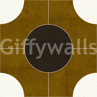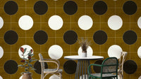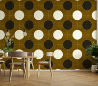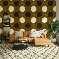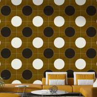 This wallpaper's design is a celebration of mid-century modern aesthetics. The bold use of olive-gold and dark brown creates a rich and sophisticated contrast. The geometric shapes, primarily the central circle and the quadrant divisions, reflect the clean lines characteristic of the era. The subtle textured finish and off-white accents add a touch of understated elegance. The overall effect is one of restrained luxury and calm sophistication, perfect for adding a touch of classic design to contemporary spaces. Its versatility allows it to enhance living rooms, bedrooms, or even offices.