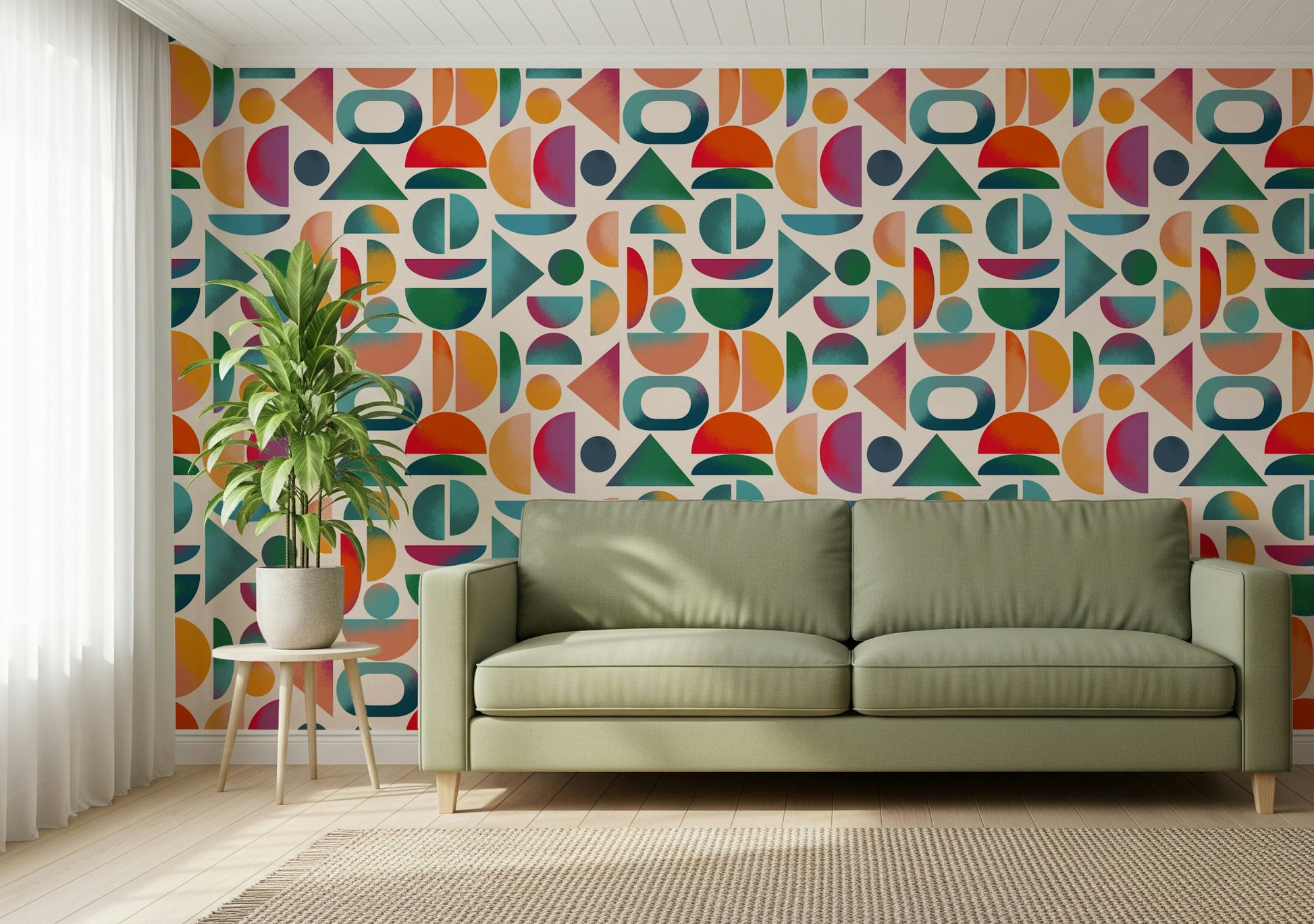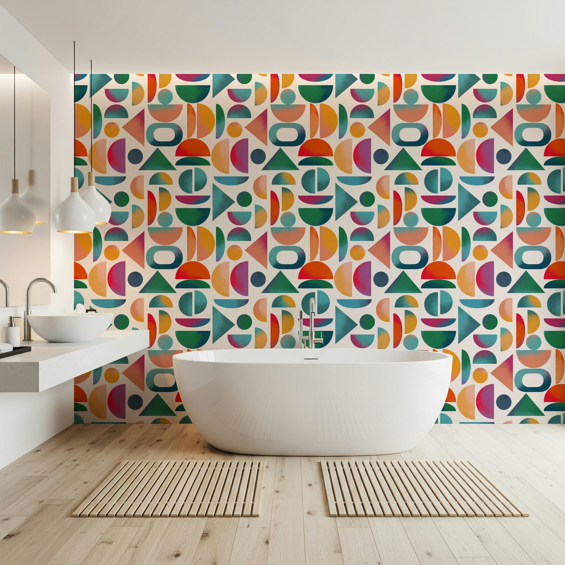 Introduce a touch of vintage style with this bold and engaging wallpaper for walls. This design uses circles, semi-circles and triangles in bright, playful colors. Coral, teal, orange, pink, and green work together in a seamless layout, producing a warm and lively effect. This striking wallpaper works in dining rooms, kitchens, or hallways, bringing a retro vibe to any setting. The geometric shapes give structure and balance, while the textured effect adds visual interest. Create a space that’s both modern and inviting with this vibrant design.