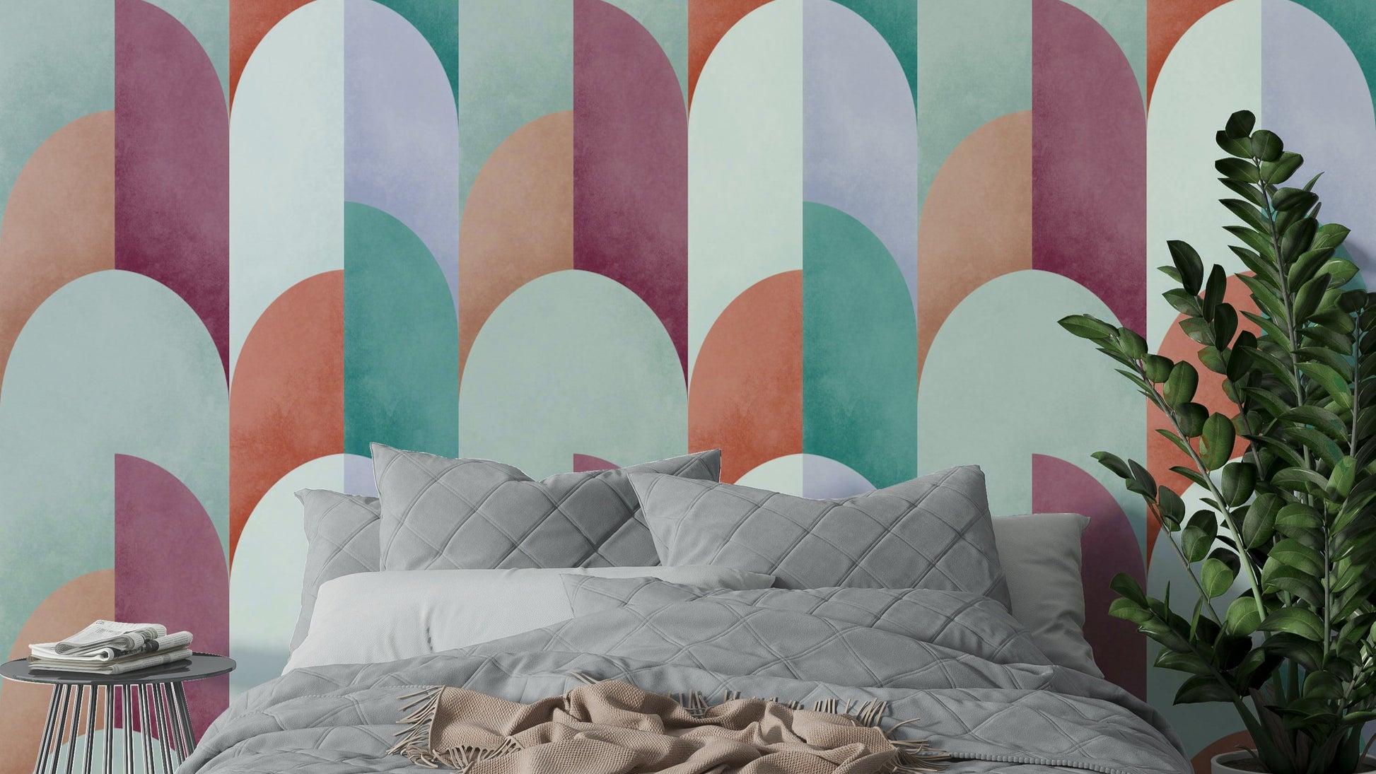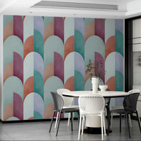 Evoke the warmth and serenity of a fading sunset with 'Mid Mod Geometry Sundown'. This wallpaper blends the clean lines of mid-century modern design with a calming palette of sundown hues. Geometric arcs interlock and overlap, creating a visually engaging composition that's both structured and soothing. The colours, reminiscent of a twilight sky—soft teal, dusty rose, muted plum, and gentle lavender—infuse a sense of tranquility and sophistication into any space. The slightly textured finish adds depth and a tactile quality to the design, enhancing its overall appeal. Perfect for creating a focal point or adding a touch of retro-chic elegance, 'Mid Mod Geometry Sundown' is a sophisticated choice for those seeking a blend of artistic flair and understated luxury in their interior decor.