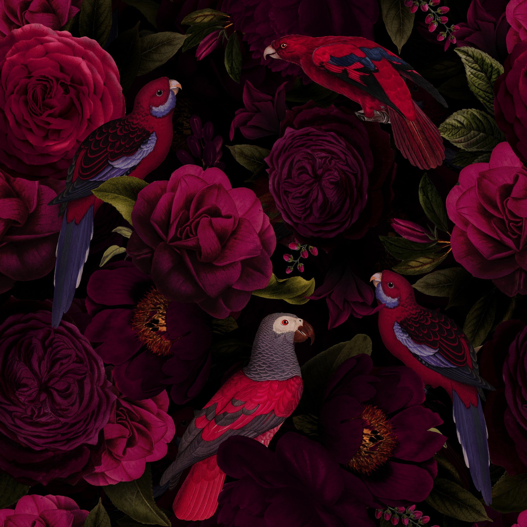 Unfold the captivating allure of 'Midnight Bloom,' a wallpaper design where deep crimson roses and vibrant parrots dance in harmonious darkness. The rich, saturated colors evoke a sense of mystery and romance, creating a breathtaking visual tapestry. Detailed botanical illustrations of roses and peonies are skillfully blended with the lifelike depictions of parrots, producing a unique blend of nature's elegance and vibrant wildlife. The design's seamless pattern allows for a luxurious and immersive experience, turning any room into a secret garden bathed in the shadows of night.