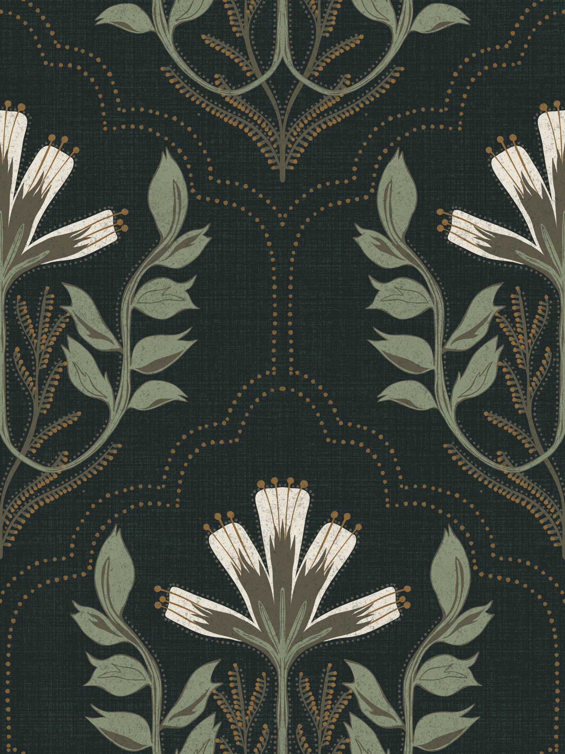 Adorn your space with Midnight Bloom Tapestry, a unique wallpaper for walls showcasing stylized floral arrangements on a textured dark background. Pale green leaves and cream flower petals with warm gold stamen offer a calming contrast. Its symmetrical design creates a tapestry effect, ideal for bedrooms or living rooms that crave a touch of sophistication and natural elegance. Elevate your interior with its serene pattern and soothing colors.