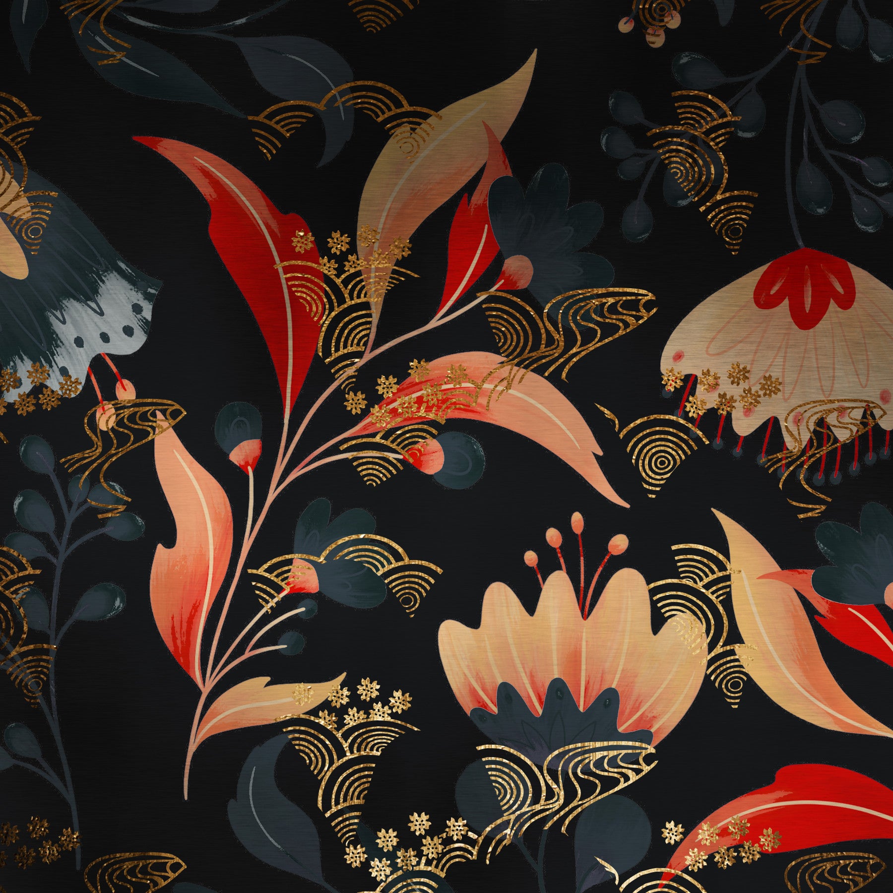 Immerse yourself in the enigmatic allure of Midnight Bouquet a digital wallpaper that captures the essence of a secret garden blooming under the cloak of night. Deep, dark hues form the backdrop, creating a sense of mystery and depth, while vibrant coral and peach blooms emerge, offering a striking contrast. Intricate golden details, resembling delicate filigree and stylized waves, intertwine with the foliage, adding a touch of opulence and intrigue. This wallpaper is not merely decorative; it's an experience, a visual poem whispering tales of moonlit petals and hidden beauty. Perfect for those seeking a sophisticated, artistic, and subtly dramatic ambiance, "Midnight Bouquet" will transform your screen into a captivating canvas of nocturnal flora.