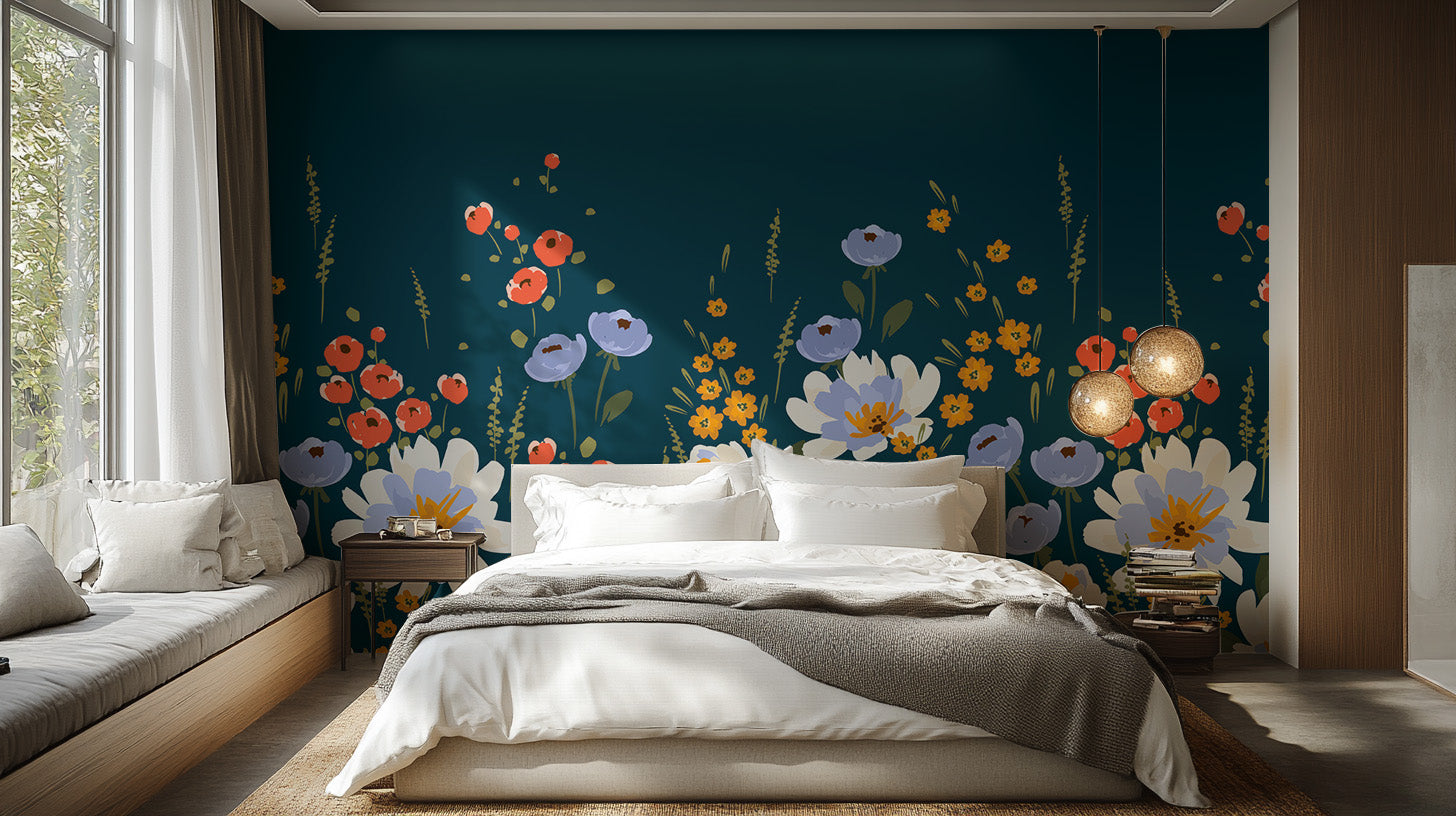 Peaceful Midnight Garden floral mural wallpaper for serene bedrooms.