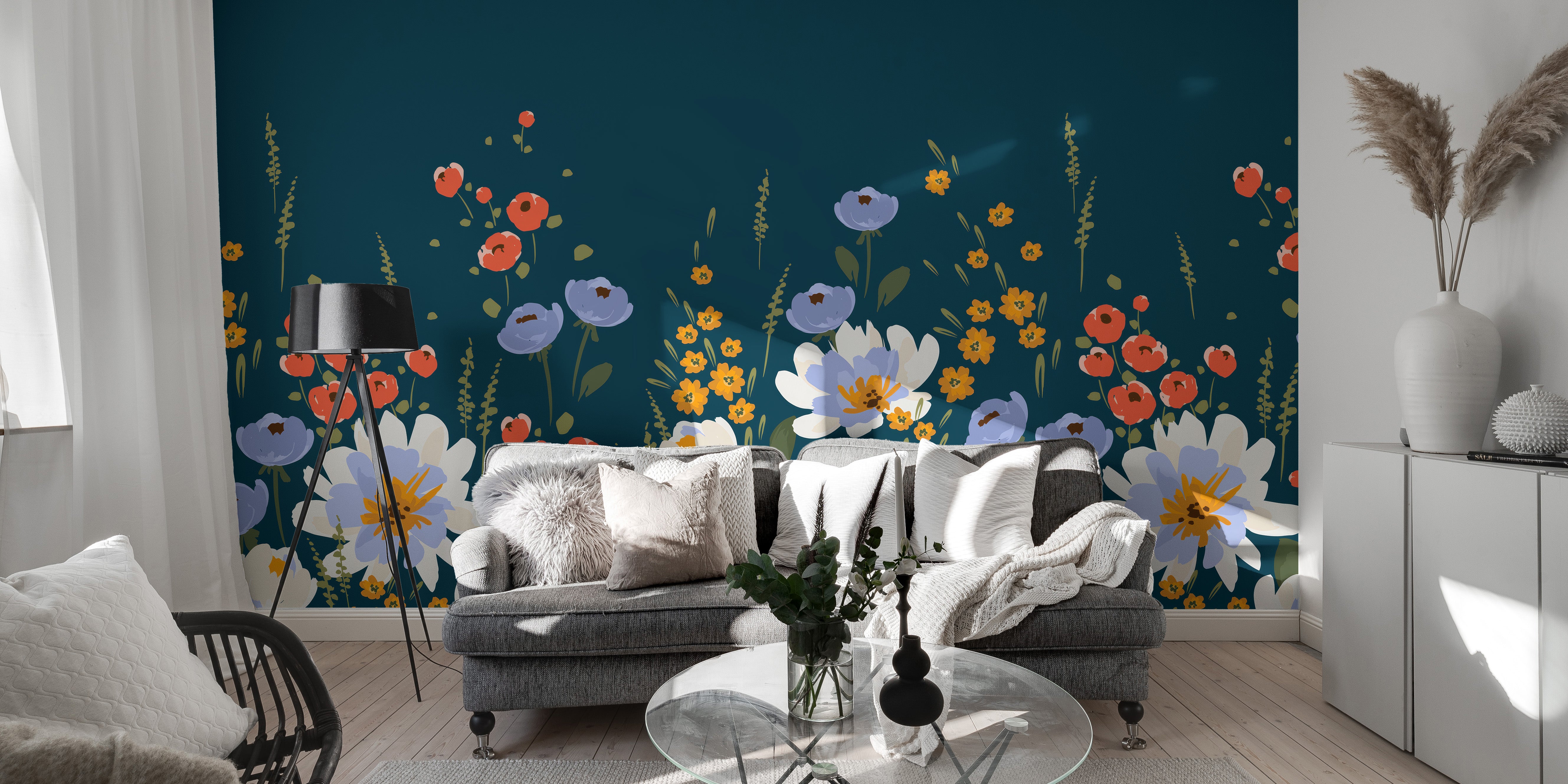 Lush floral Midnight Garden mural wallpaper for inviting living rooms.