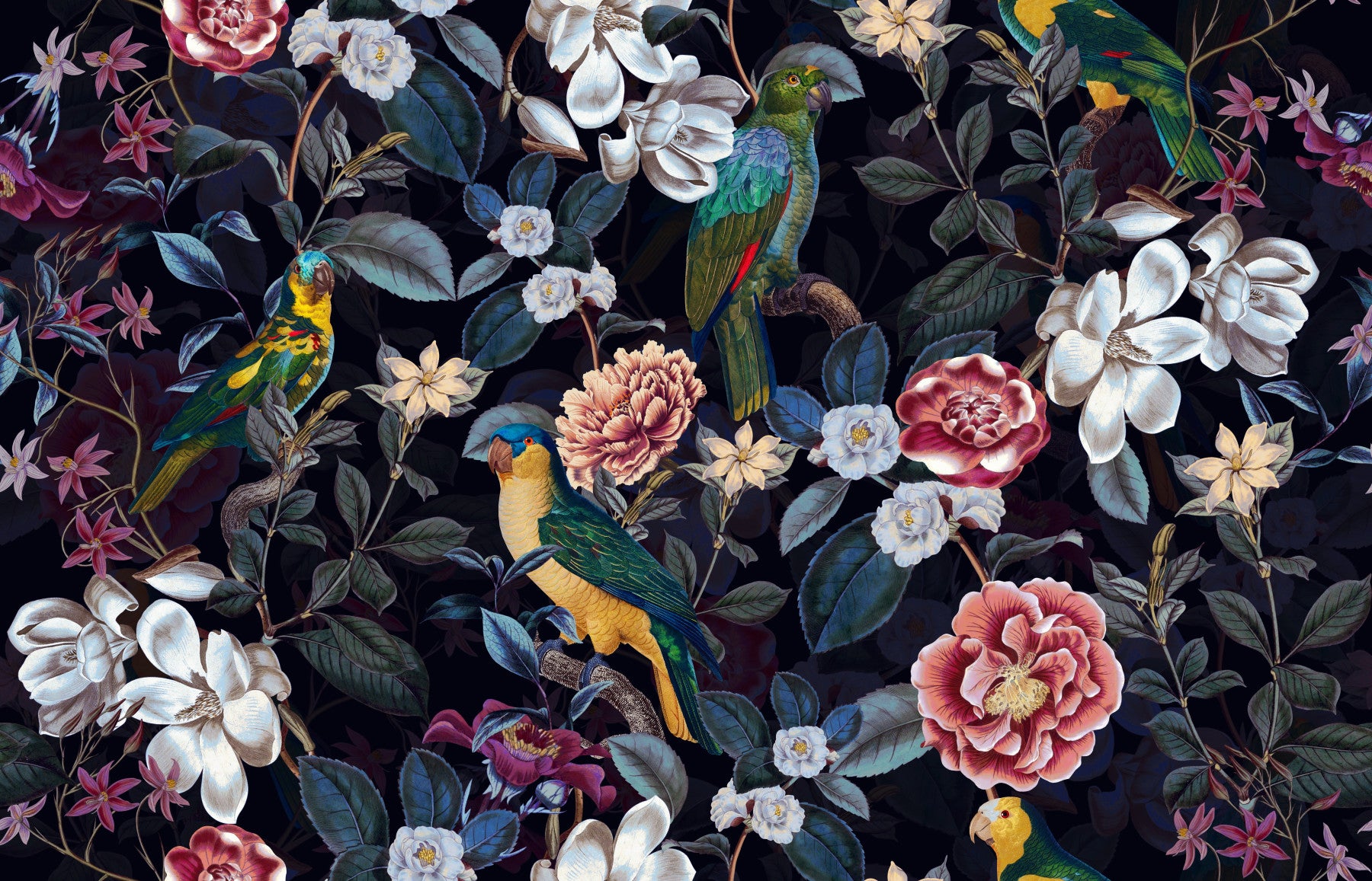 Bold floral wallpaper with deep hues and detailed foliage patterns.