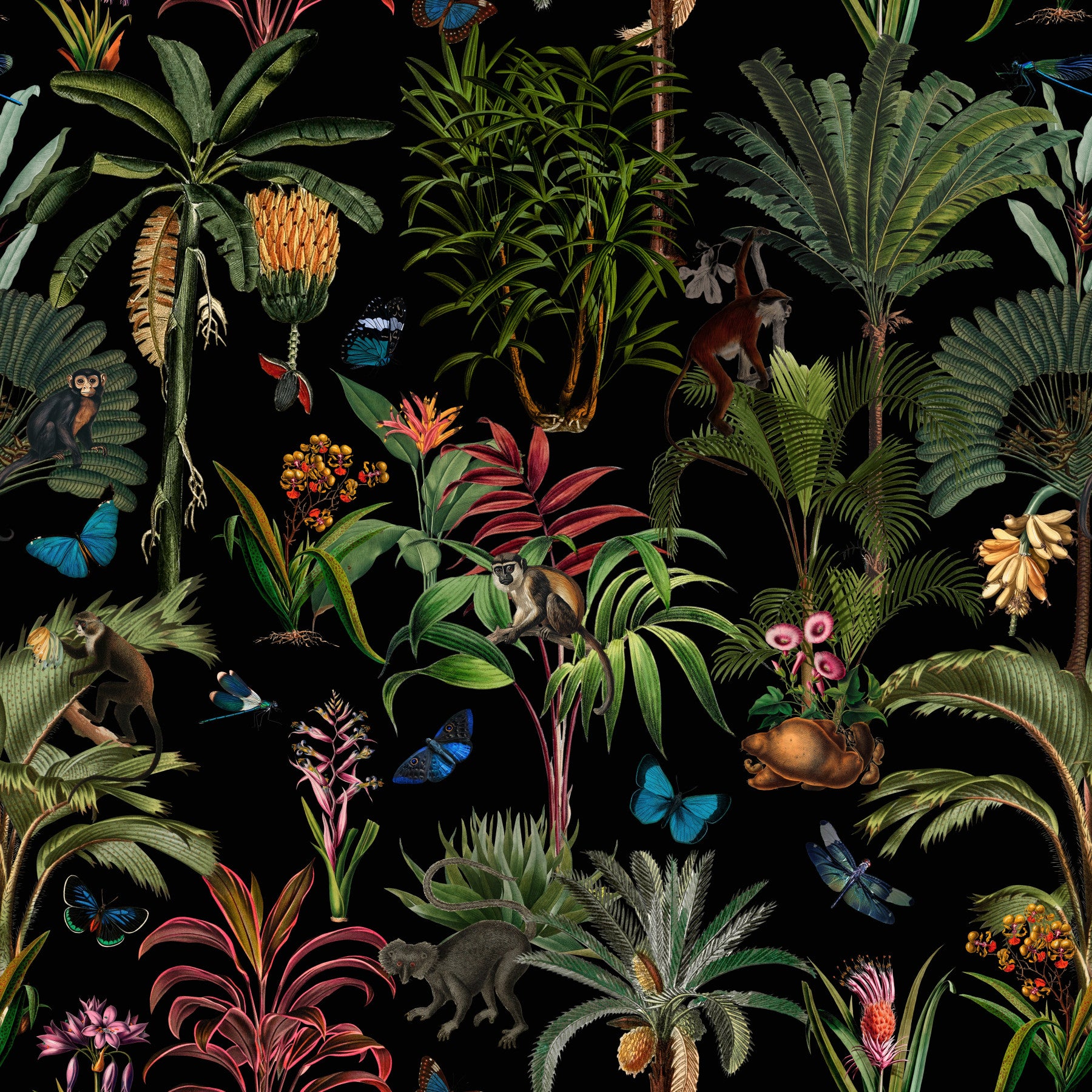 Immerse yourself in the lush depths of 'Midnight Jungle,' a captivating wallpaper design. Against a dramatic black backdrop, vibrant tropical foliage explodes with life. Intricate details in the hand-drawn style showcase a variety of exotic plants, from towering palm trees to delicate orchids and banana leaves. Playful monkeys and iridescent butterflies flit among the leaves, adding a touch of whimsical charm to the dense jungle scene. The rich jewel tones of the greens, reds, and oranges create a luxurious and sophisticated atmosphere, perfect for adding a touch of exotic elegance to any room.