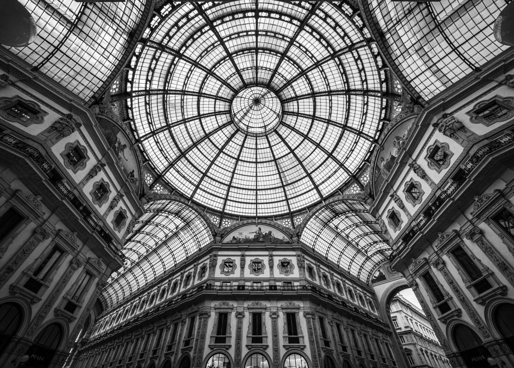 Gaze upwards and be captivated by 'Milan's Vaulted Vision,' a stunning black and white wallpaper that captures the architectural grandeur of Milan's Galleria Vittorio Emanuele II. The image showcases the magnificent glass-domed ceiling, a marvel of engineering and design, reaching towards the sky in a symphony of geometric precision. Intricate ironwork supports the glass panels, creating a mesmerising pattern that evokes a sense of awe and wonder. Below, the ornate facades of the surrounding buildings add to the opulence of the scene, their classical details rendered in sharp relief. This wallpaper transforms any screen into a window onto Italian artistry, offering a timeless perspective on one of Milan's most iconic landmarks and inviting you to lose yourself in its captivating beauty.