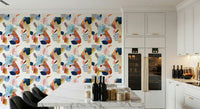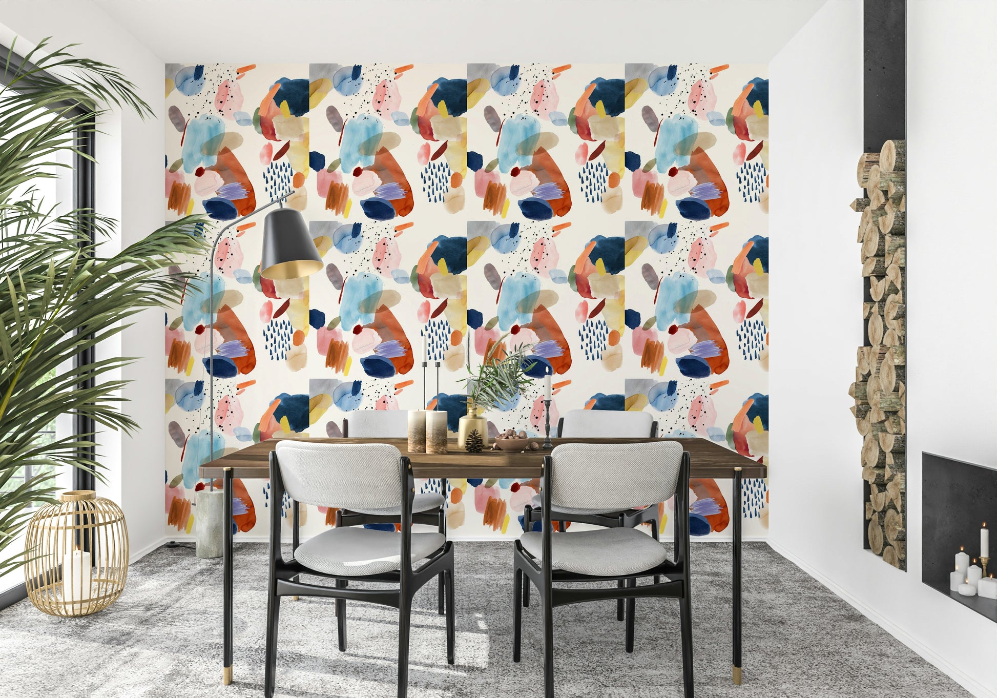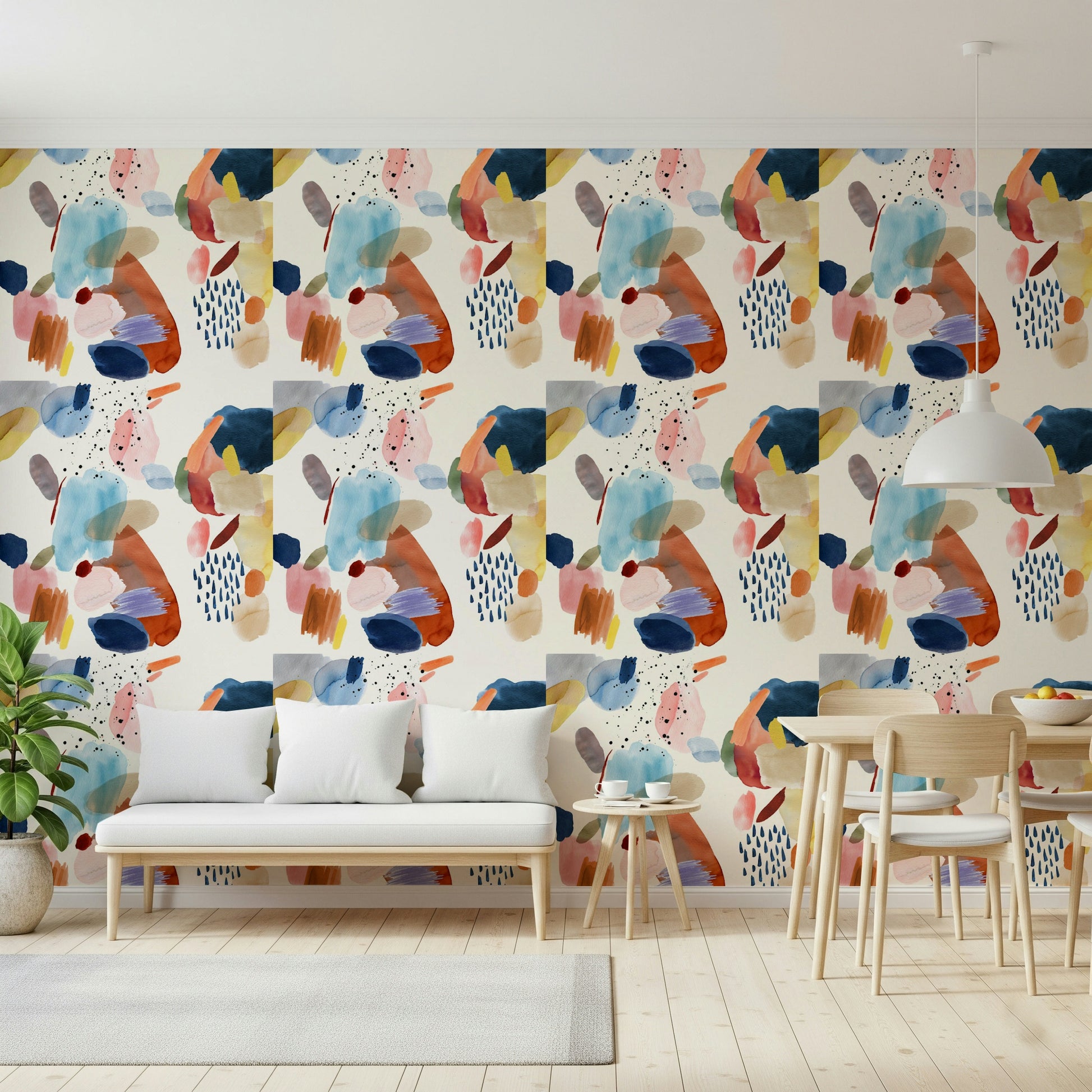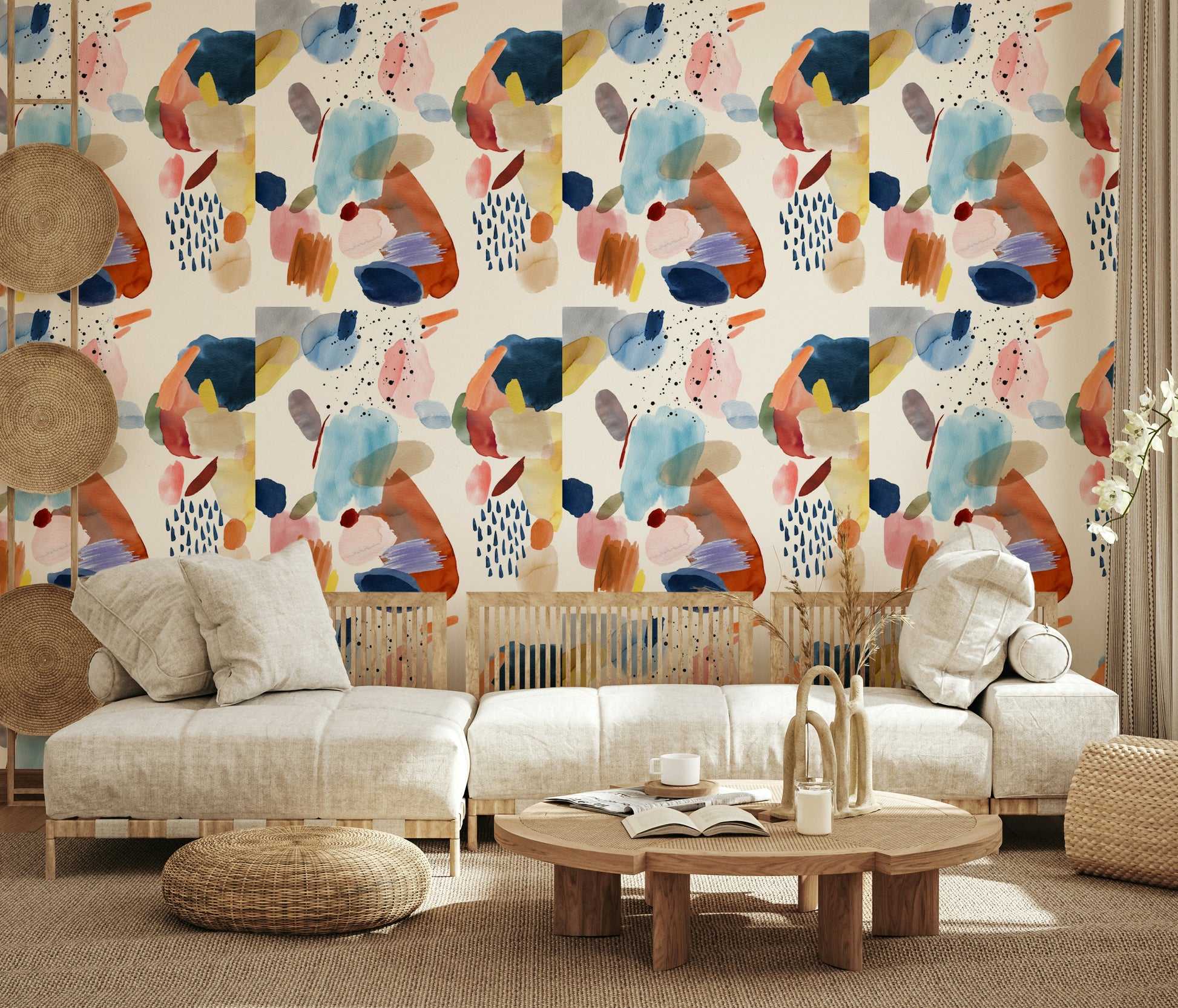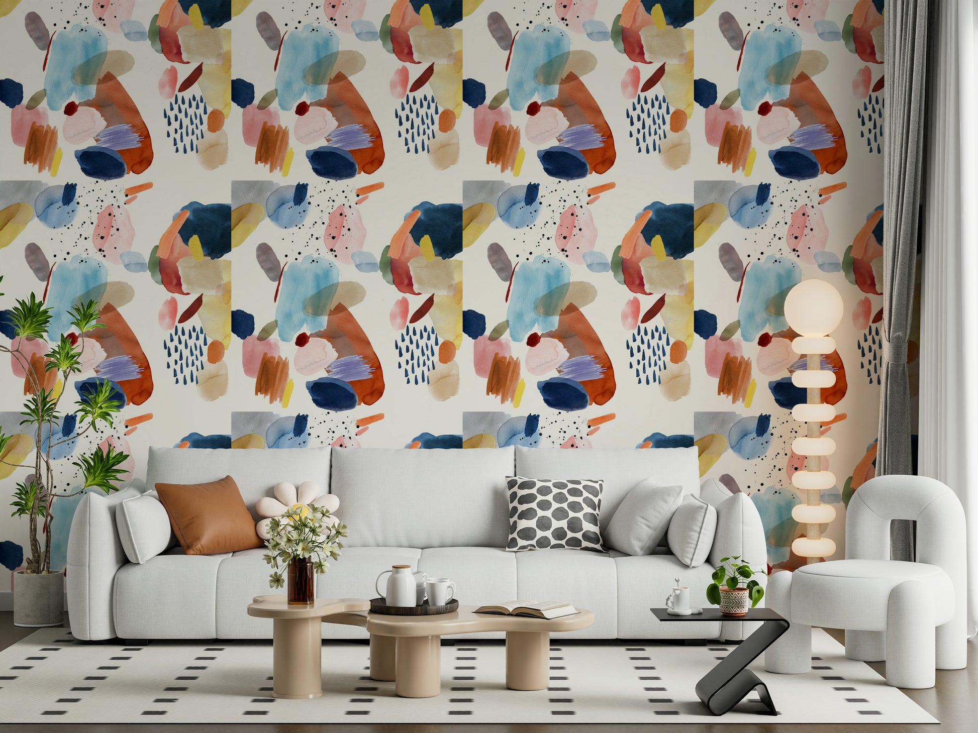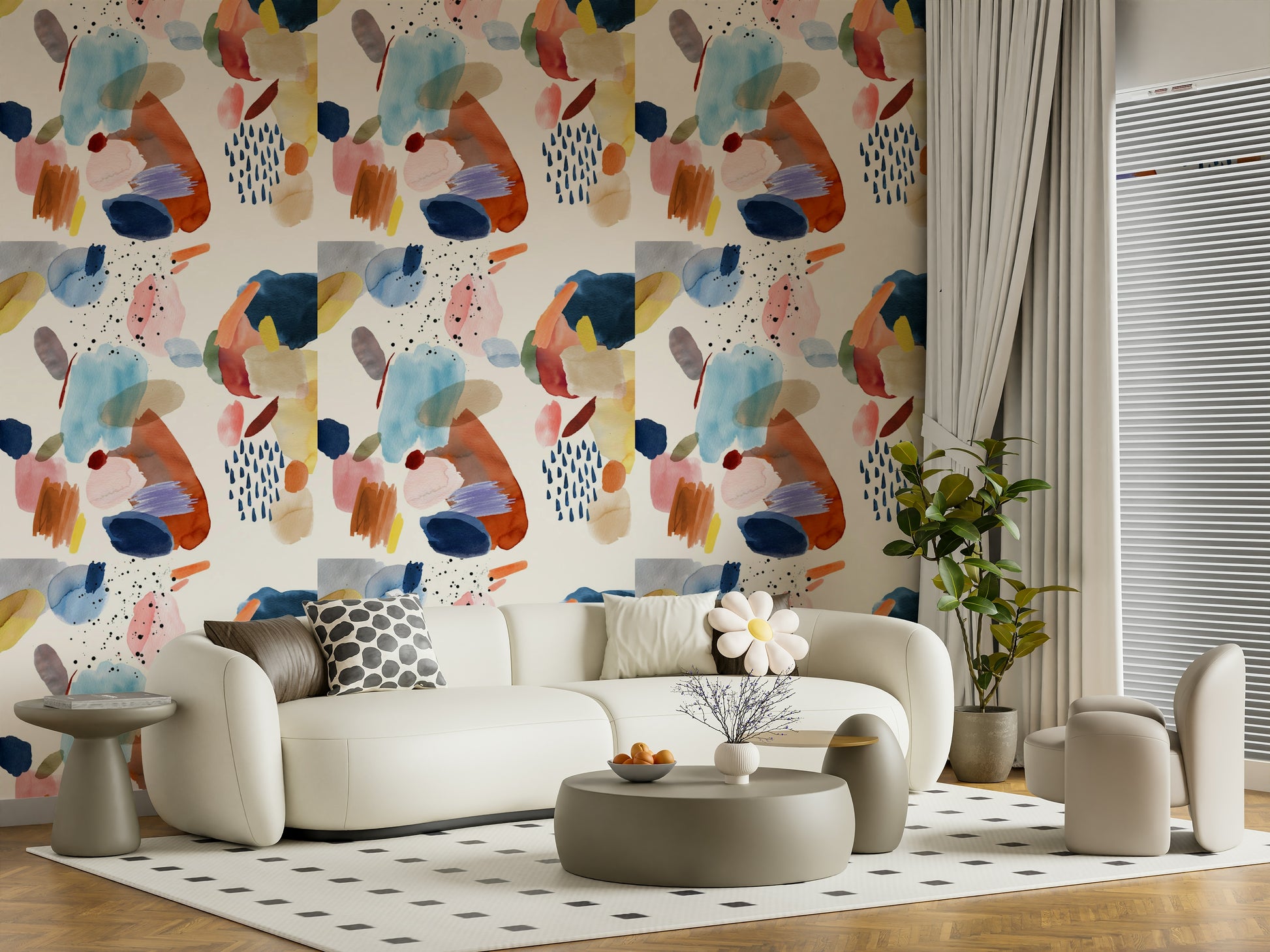 Evoke the raw beauty and organic textures of the earth with our Mineral Abstract Painting wallpaper. This stunning piece captures the essence of mineral formations through flowing watercolour strokes and expressive abstract shapes. A harmonious palette of earthy tones - from deep blues and ochre yellows to gentle pinks and muted browns - creates a sense of grounded tranquility, reminiscent of natural rock formations and precious stones. Delicate splatters of black and strategically placed brushstrokes add depth and intrigue, simulating the intricate veining and crystalline structures found within minerals. This wallpaper is a captivating blend of artistry and nature, perfect for adding a touch of sophisticated organic style to any space. Immerse yourself in the subtle nuances and captivating artistry of this unique abstract design, bringing the serene beauty of the natural world into your home or office.