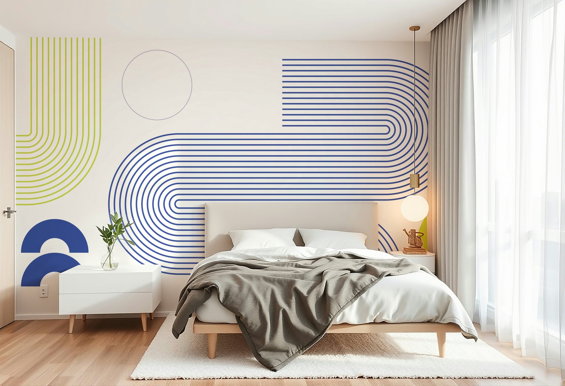 Experience the serene elegance of 'Minimalist Bauhaus Flow,' a wallpaper design that embodies the principles of form and function. Clean lines in calming blue and subtle lime green create a dynamic yet balanced composition. Interlocking curves and parallel lines evoke a sense of effortless movement and visual rhythm, characteristic of Bauhaus aesthetics. The minimalist palette and geometric shapes offer a sophisticated backdrop for any room, promoting a feeling of calm and focus. This wallpaper is a perfect blend of modern design and timeless sophistication, bringing a touch of artistic flow to your space.