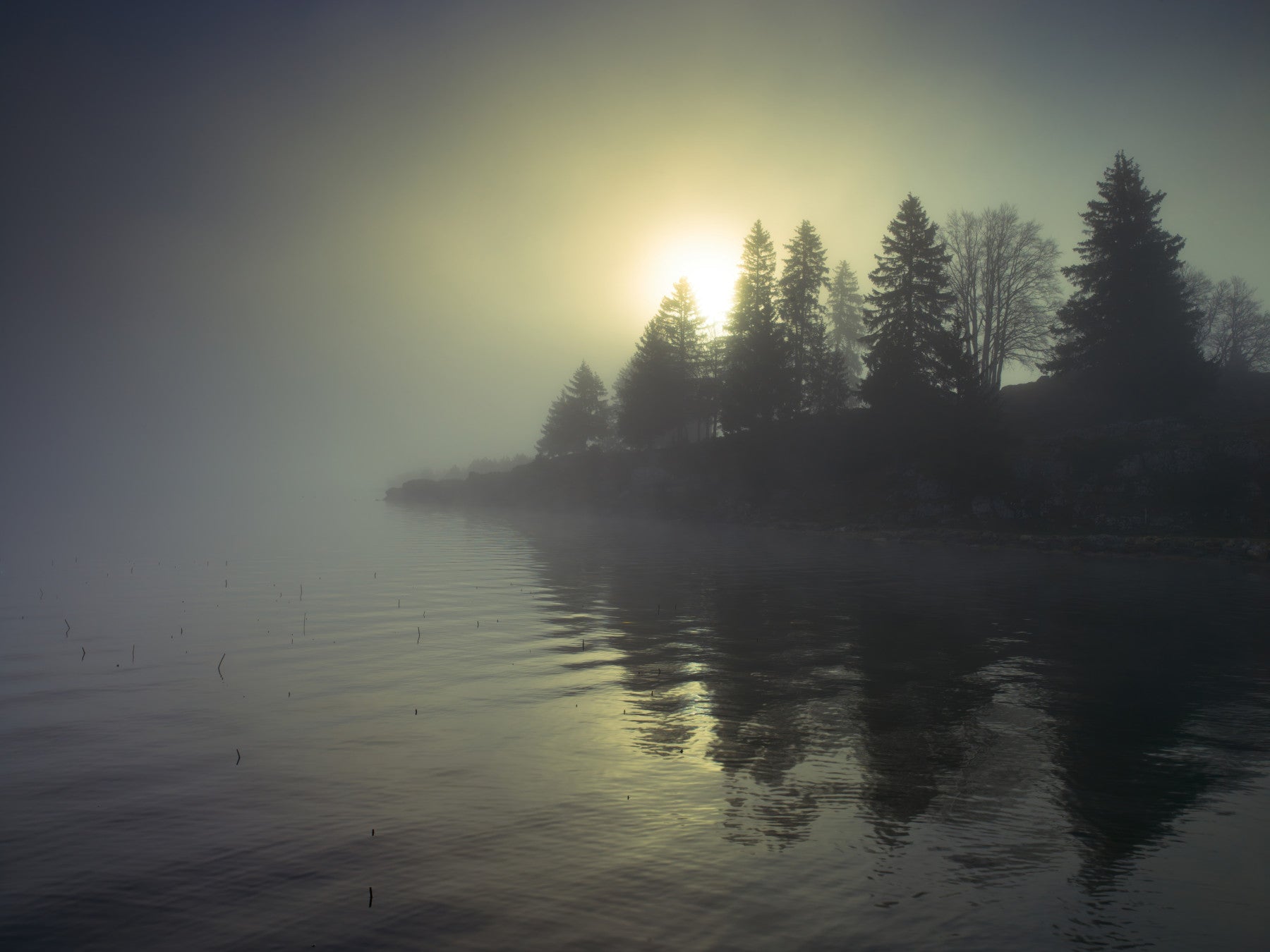 Still lake at misty dawn. Wrap your walls in the tranquil embrace of "Misty Dawn". This atmospheric wall décor captures the ethereal beauty of a lakeside landscape awakening in the soft, muted light of early morning. Silhouetted trees stand sentinel against a backdrop of swirling mist, their forms partially obscured, hinting at the mysteries hidden within the tranquil scene. The sun, a luminous orb barely visible through the haze, casts a gentle, golden glow that reflects softly on the still water, creating a serene and reflective ambience. This evocative scene invites contemplation and a sense of peaceful escape, perfect for creating a calming sanctuary within your living space. Bring the serene beauty of nature's awakening into your home.