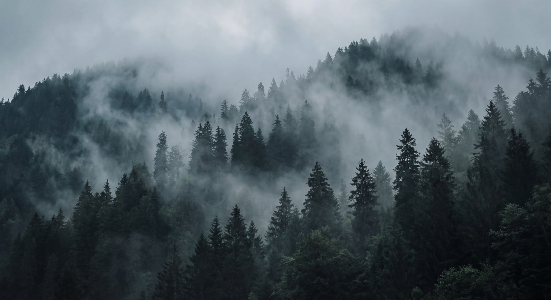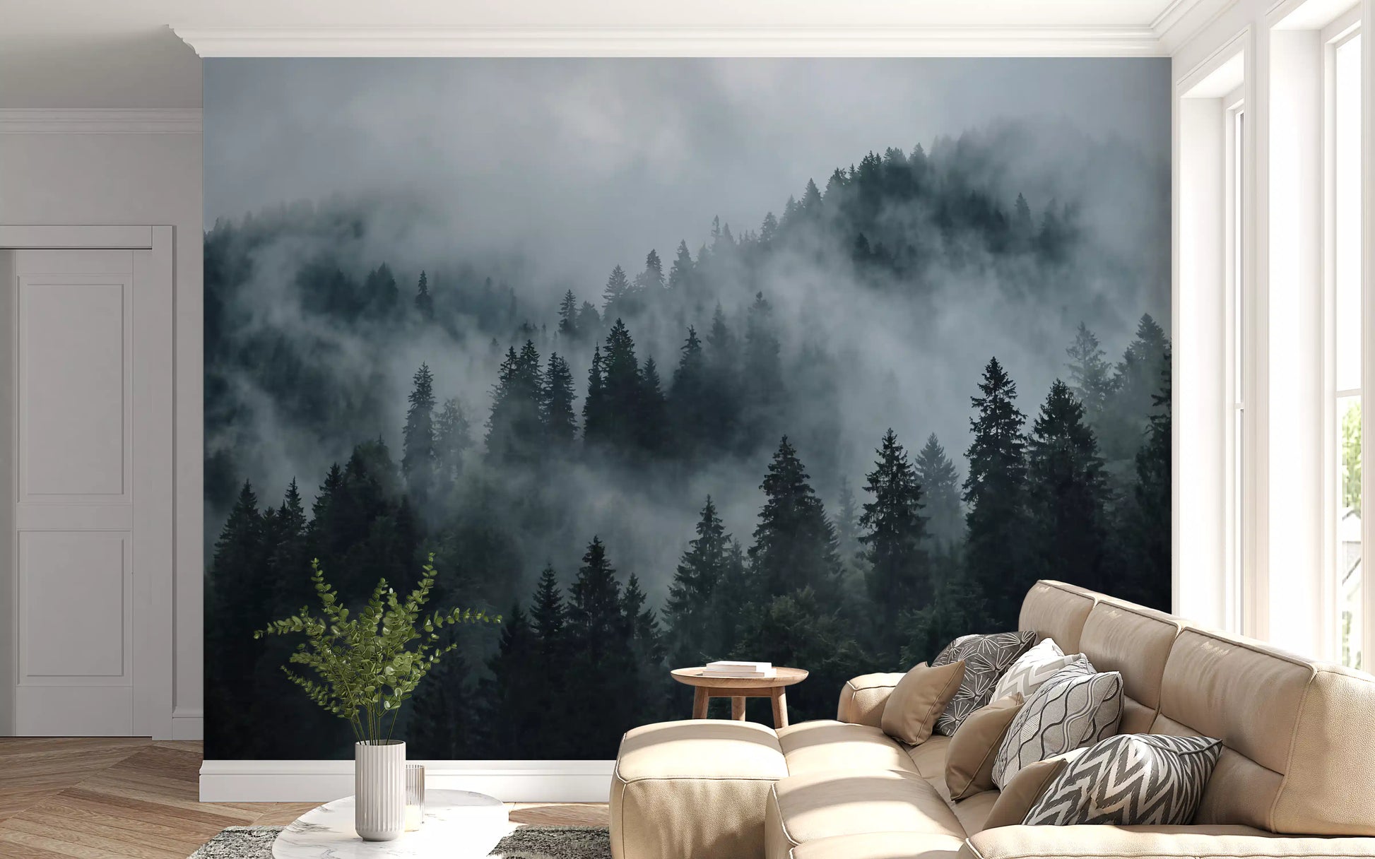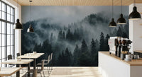 This stunning wallpaper for walls captures the serene beauty of a misty forest. Deep green conifer trees rise majestically through a swirling veil of cool grey and muted blue fog. The atmospheric design creates an immersive, tranquil escape, transforming any room into a peaceful sanctuary. This contemporary landscape complements minimalist or rustic interiors, adding depth and a touch of mysterious elegance. Install it in a living room, bedroom, or home office to evoke a sense of calm and connection with nature. The subtle colour shifts and natural texture bring the quiet majesty of a mountain woodland directly into your personal space, enhancing relaxation and contemplation.