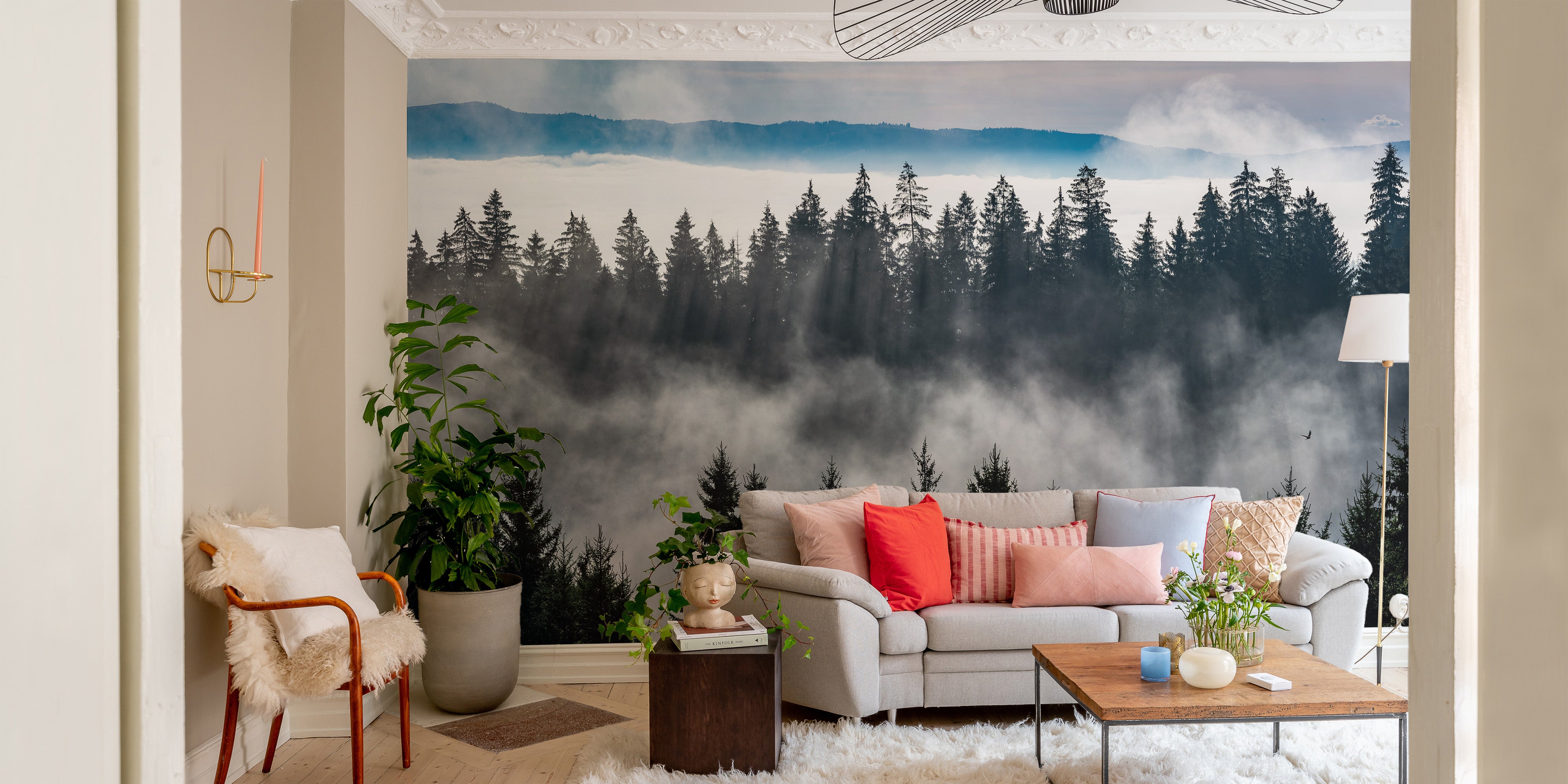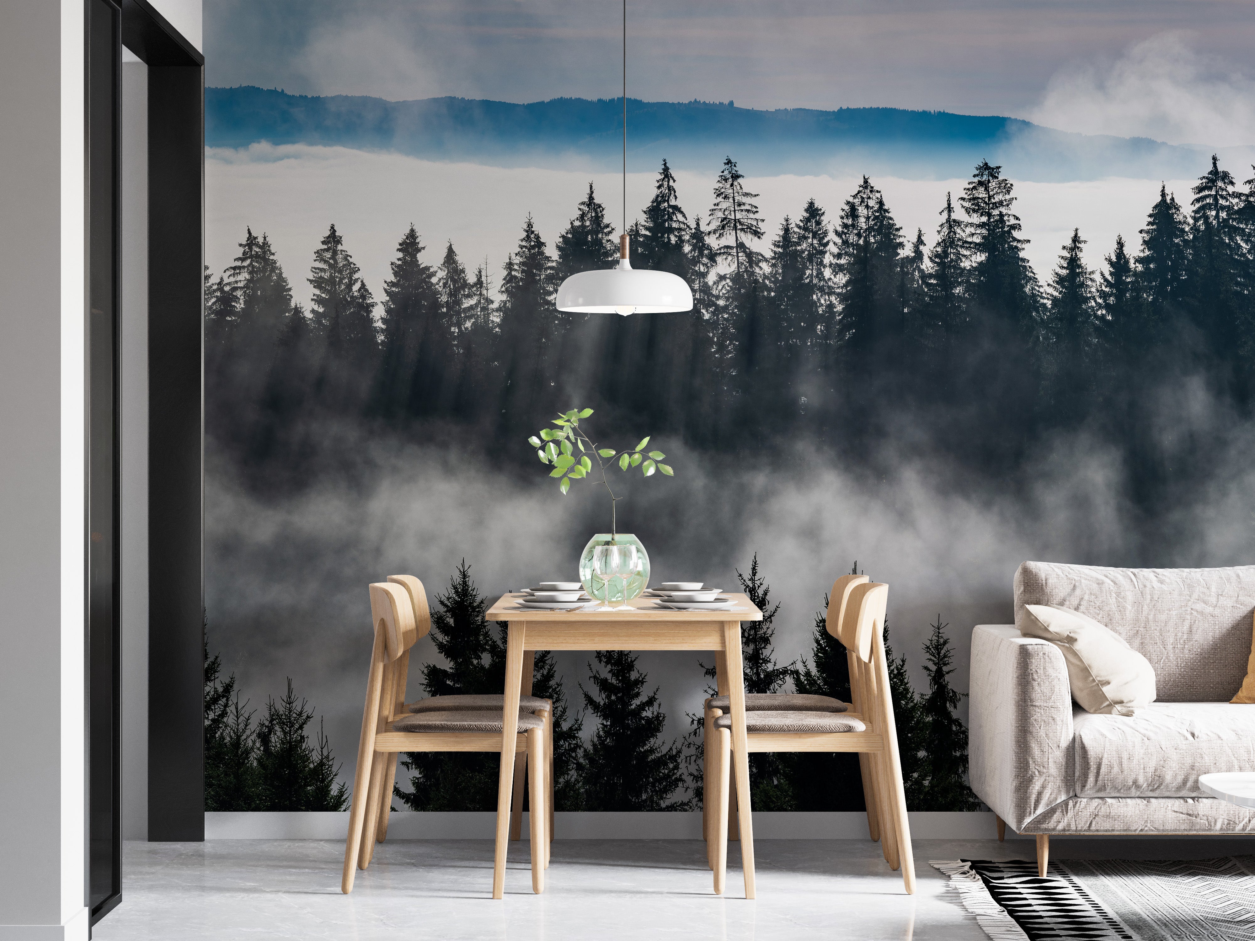 Peaceful misty forest mountain wallpaper for interiors