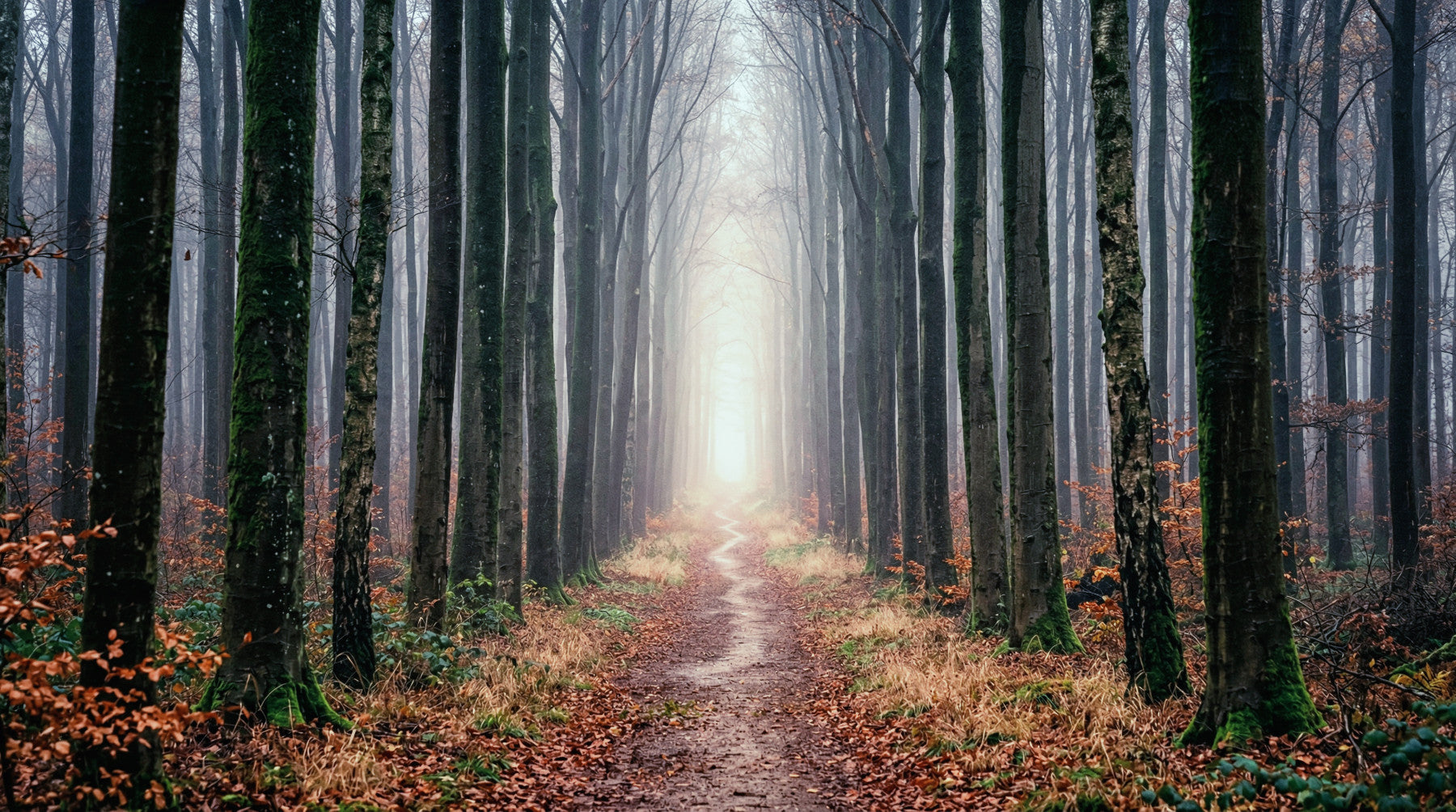 This captivating wallpaper transforms any room into a tranquil forest escape. Tall, moss-covered tree trunks create a majestic natural corridor, drawing the eye along a winding path. A soft, luminous light at the path's end imbues the design with a sense of hope and depth. The earthy colour palette features deep moss greens and rich autumnal browns from fallen leaves, beautifully complemented by misty grey and pale blue undertones in the distant fog. This atmospheric scene brings a serene and contemplative ambience to living rooms, bedrooms, or meditation areas. The design enhances interior spaces by creating an immersive, peaceful backdrop, inviting calm and connection with nature. It's perfect for establishing a feature wall that sparks wonder.