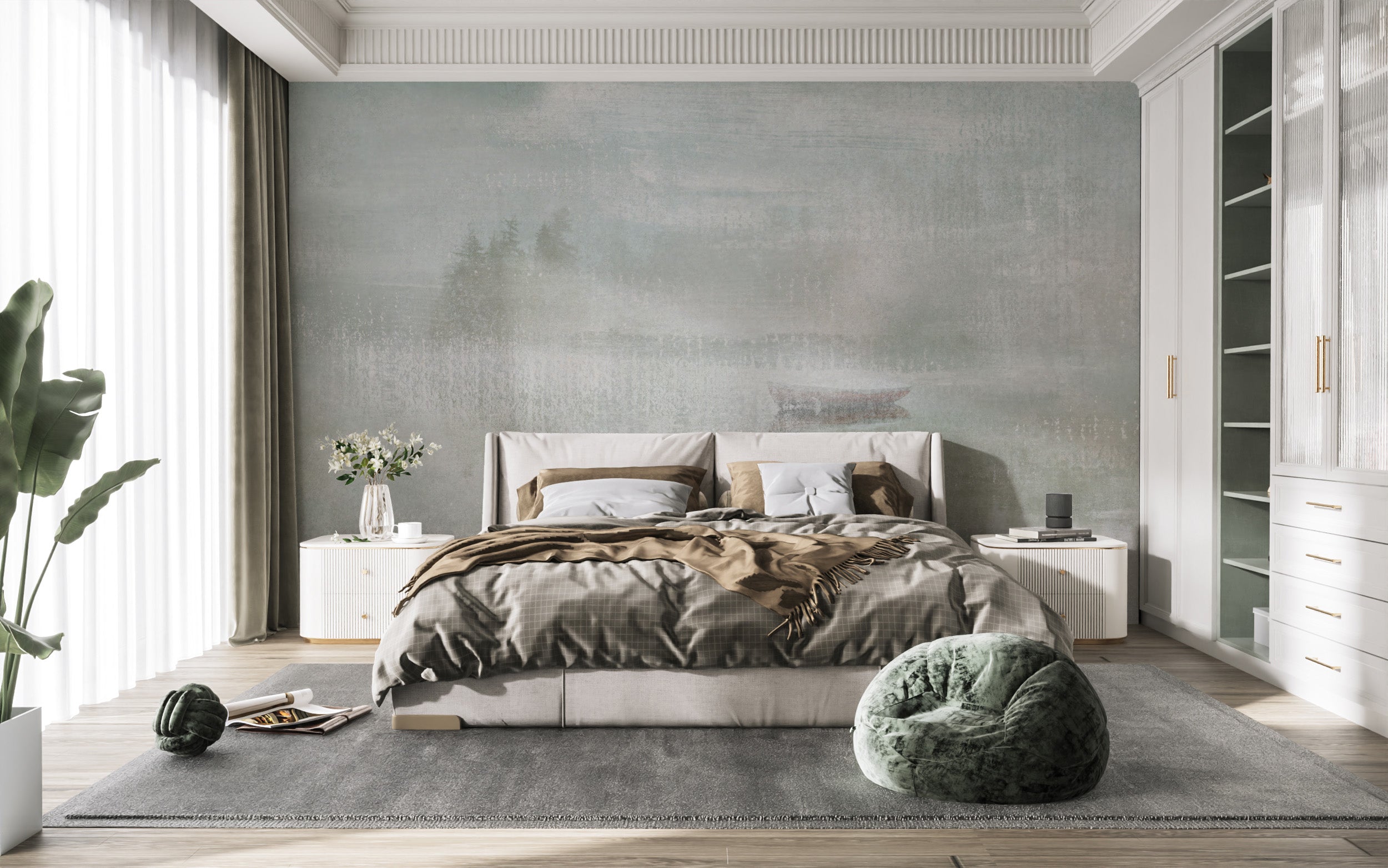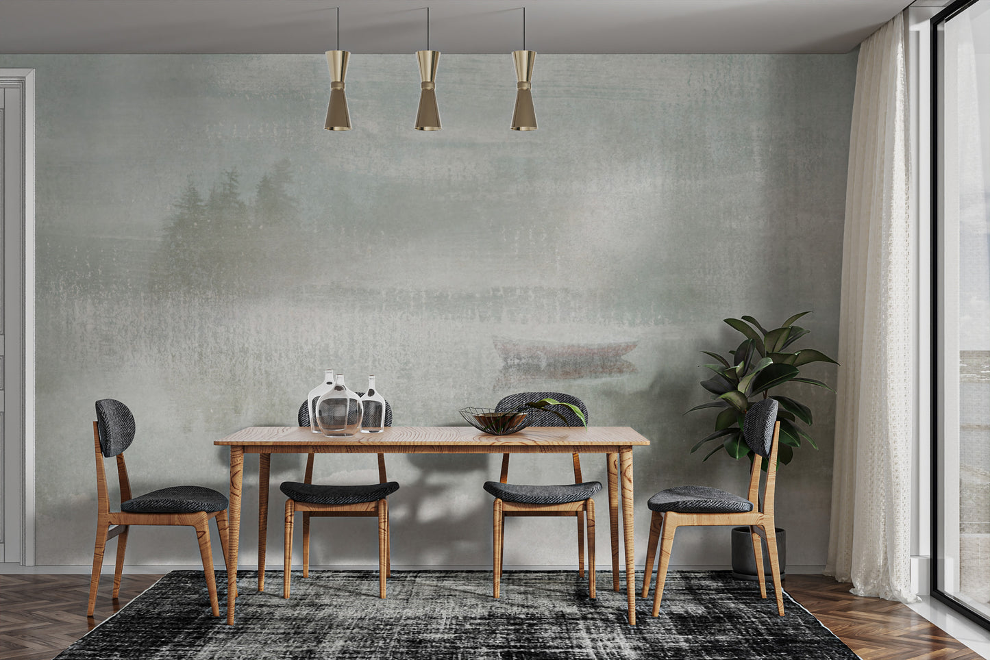 This serene, softly textured green-and-beige colored abstraction and gentle latticework resemble mist at the forest end, along with subtle detail and perfect silhouette in reflections as far as this fragile wooden boat would take itself upon calm misty lake waters, in turn enhancing your place like an aesthetic look at every interior that brings your elegance from refined nature within these abstract creations, so don't delay: have Free Shipping Order today this beautifully decorated piece—misty lake abstract wallpaper.