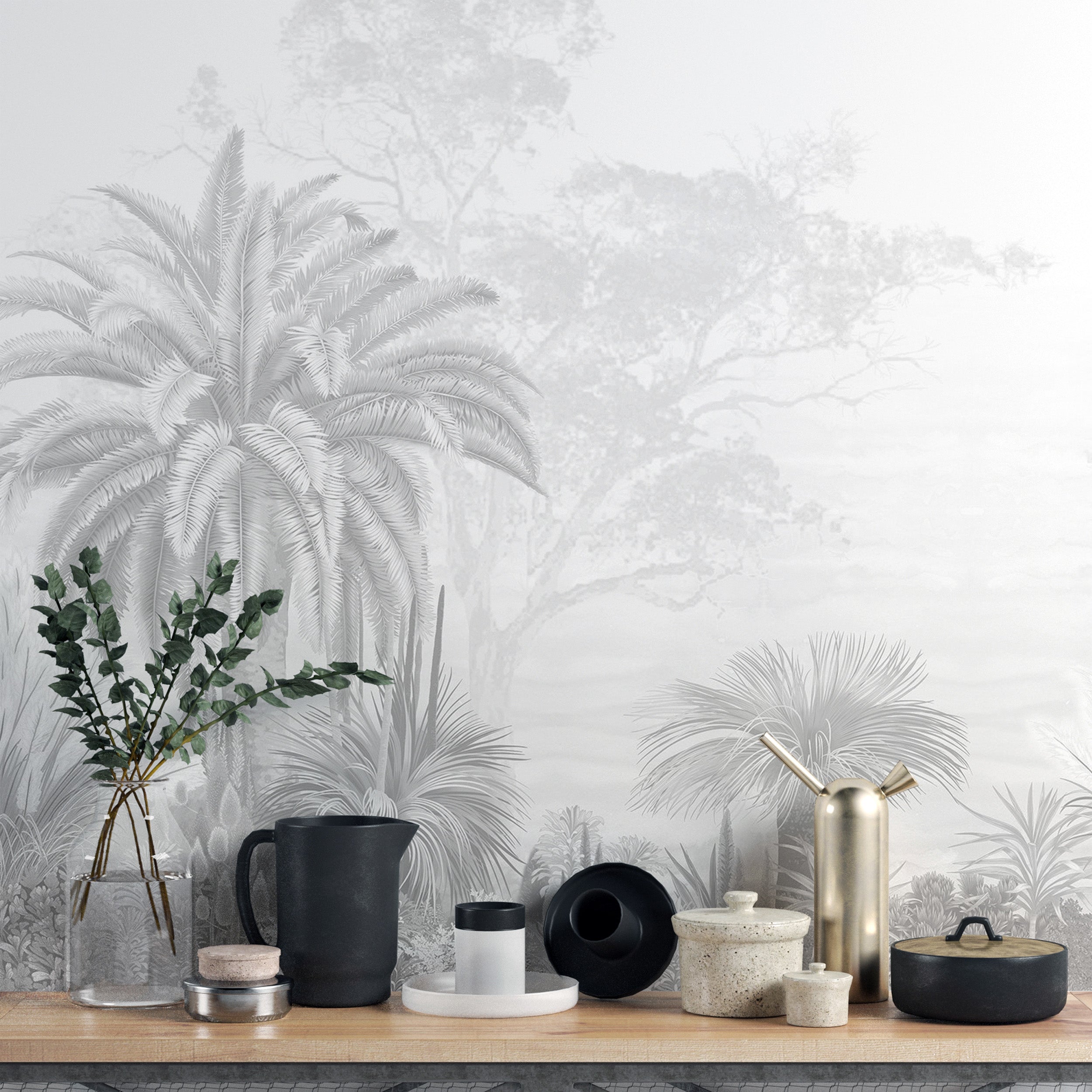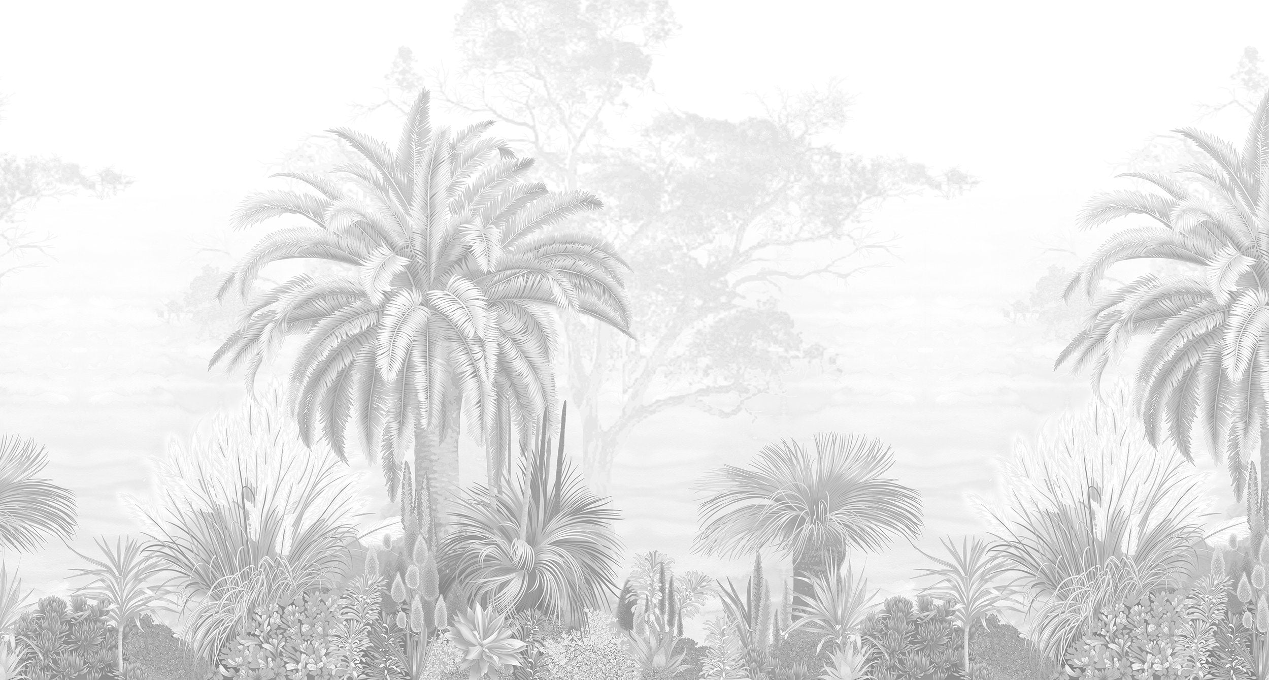 Bring nature indoors with misty monochrome tropical wallpaper. This tropical palm tree wallpaper features detailed palm leaves and exotic plants in soft grey tones, creating a calming effect for any room. The jungle landscape mural blends seamlessly with modern or classic interiors, adding depth and style. The misty background in this monochrome tropical wallpaper adds a subtle, elegant touch, perfect for living rooms, bedrooms, or offices. The foggy forest mural highlights natural textures, making it an ideal choice for nature lovers looking to create a serene, sophisticated wall design.