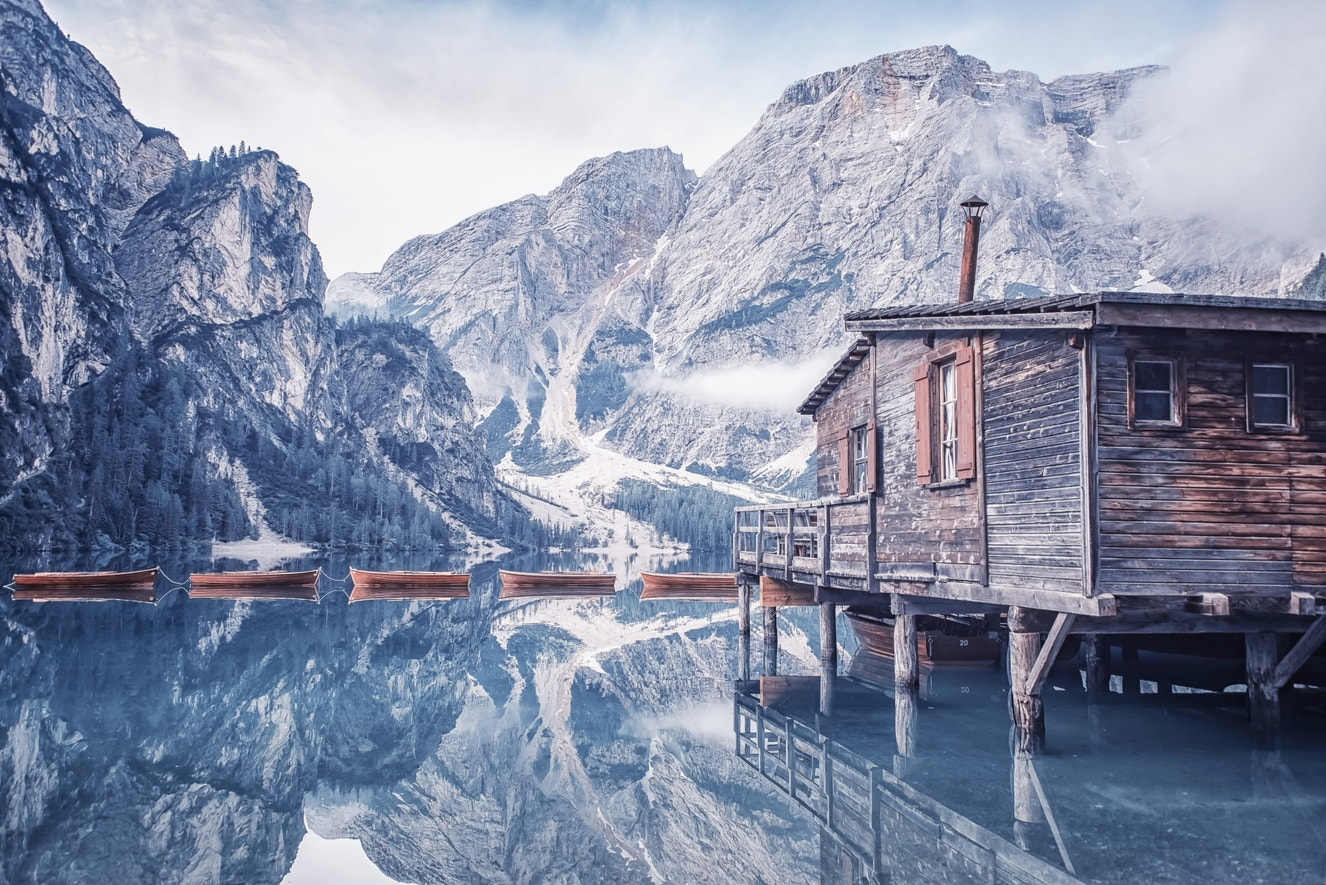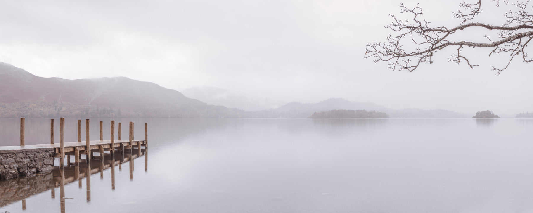 Wooden pier on the lake. Find tranquility with this landscape embracing calmness and quiet moments. The muted tones and the misty backdrop create a soothing effect. A wooden dock and a bare tree branch add natural elements, contributing to a serene atmosphere. Ideal wallpaper for walls in a bedroom or living room, this design introduces a relaxing feel. It complements interiors with a focus on minimalism, Scandinavian design, or any space where calmness is desired.