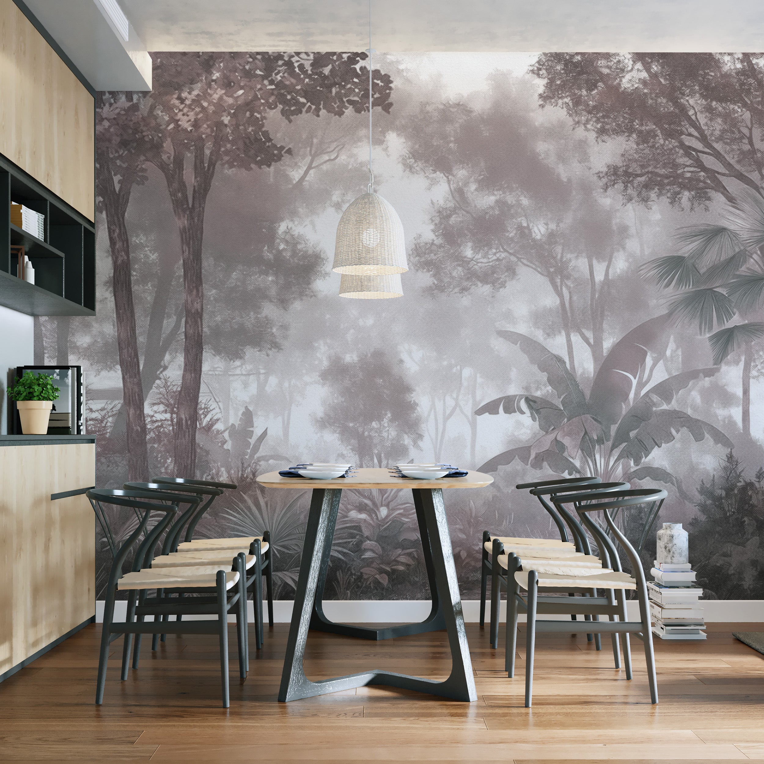 Create a serene atmosphere with the misty forest wallpaper, featuring lush greenery and soft fog for a dreamy effect. The foggy jungle mural brings a natural escape indoors, blending muted tones with tropical elements. This monochrome jungle mural is designed for a timeless appeal and enhances any setting with its elegant, misty landscape. The Dreamy Nature Wallpaper adds depth with layered trees and foliage, offering a peaceful view. Crafted for sophistication, the vintage botanical wall mural complements modern and classic interiors. Experience the beauty of nature with this Tropical Forest Wall Art, offering a breathtaking forest scene in a refined style.