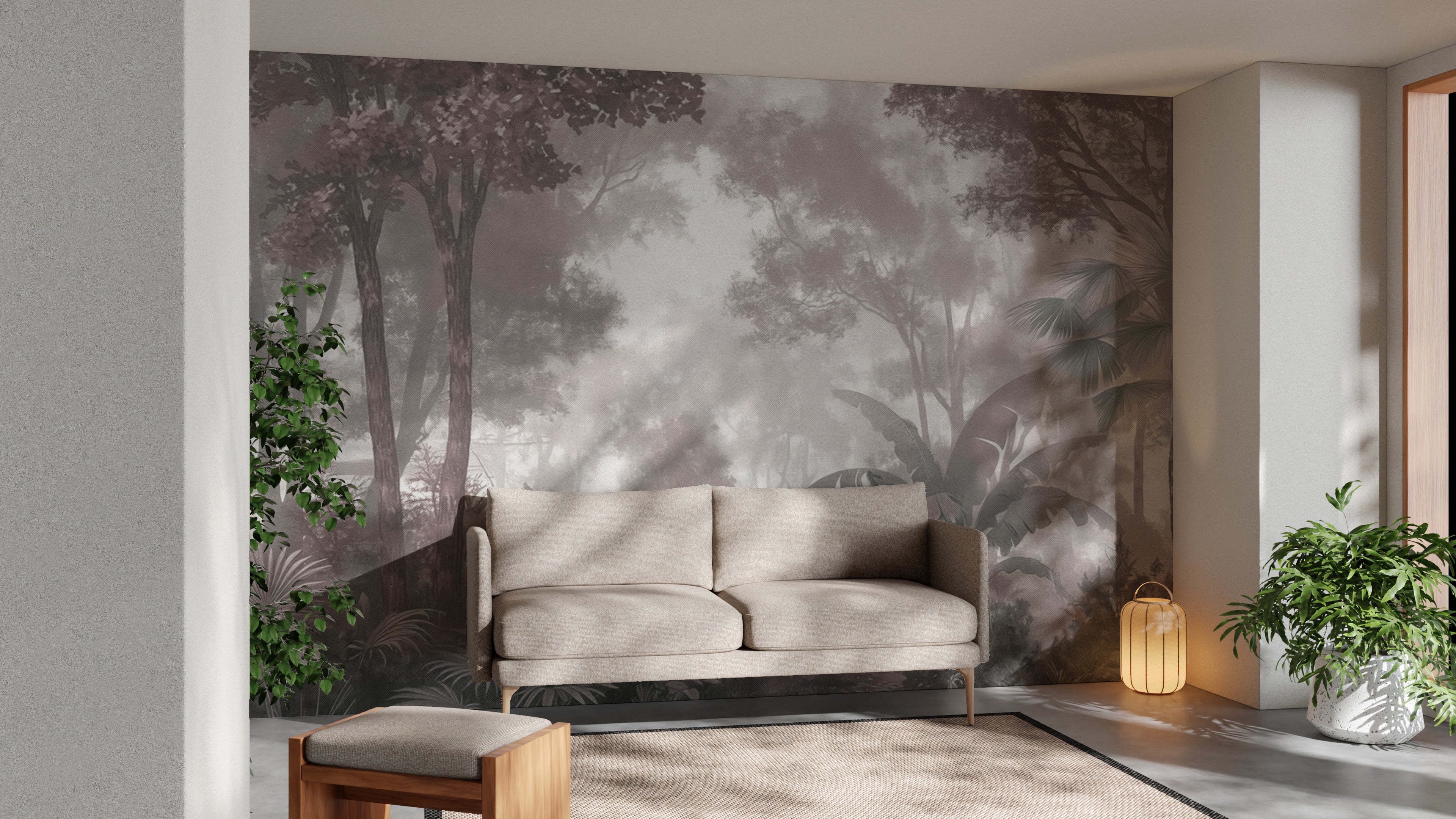 Nature-inspired Misty Forest Wall Mural with muted hues