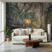 Canal in countryside with trees and pathway. Transform your space with 'Misty Woodland Glare', a captivating wall covering that evokes the serene beauty of a forest awakening. Imagine stepping into a world where the soft embrace of mist intertwines with the ethereal glow of dawn, casting a mesmerising glare through the skeletal branches of ancient trees. This artwork captures that precise moment of tranquil illumination, perfect for bringing a sense of peace and natural wonder to any room. The scene portrays a path, lightly kissed by frost, leading deeper into the woods, inviting contemplation and exploration. The delicate balance of light and shadow, the crisp air suggested by the frost, and the intricate detail of the bare trees create an immersive experience, adding depth and texture to your walls and transforming your living space into a calming woodland retreat.