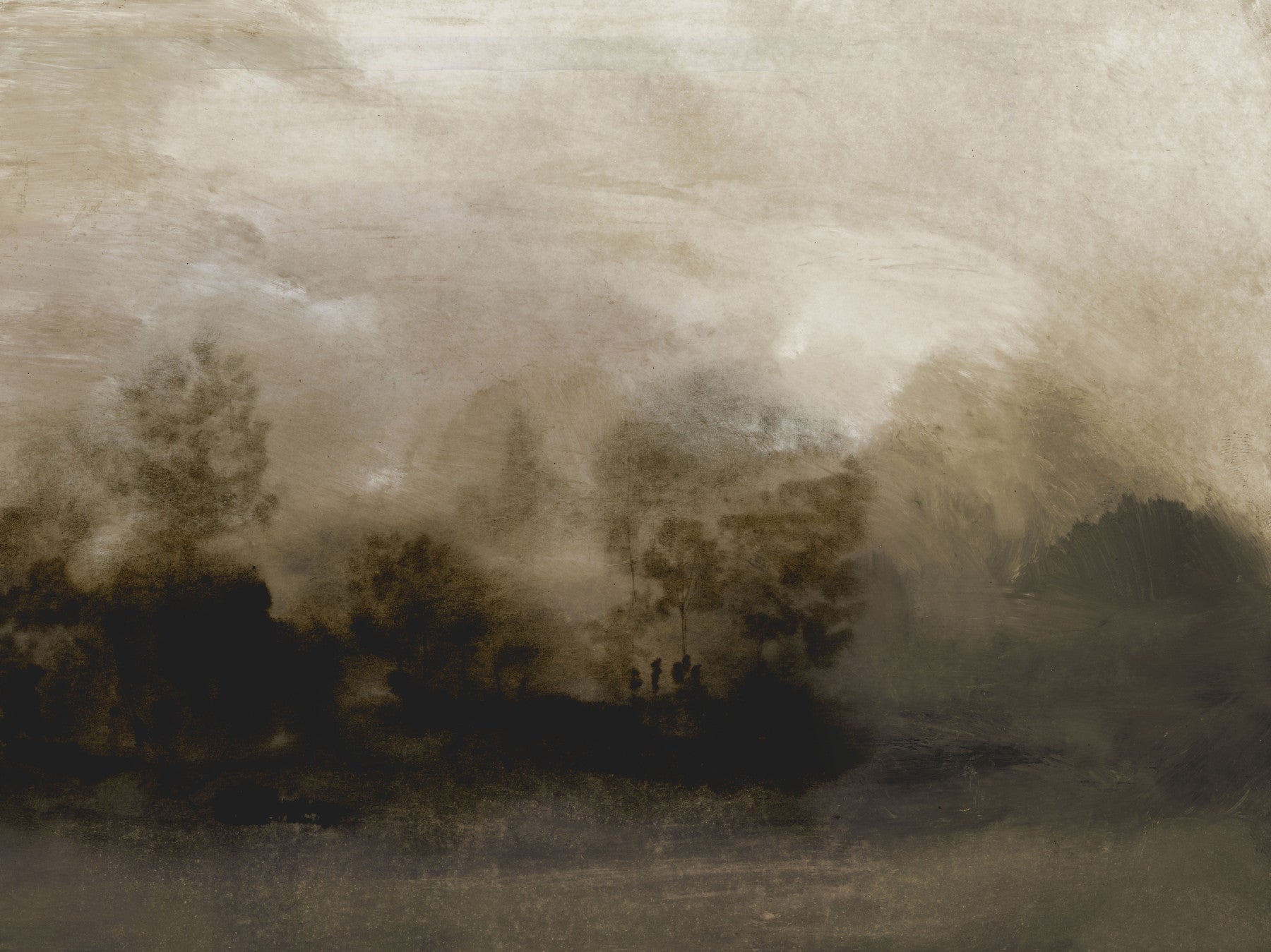 Transform your living space with this evocative landscape. The design features a dreamy scene of trees and a muted color palette, creating a tranquil atmosphere. Earthy tones and brushstroke textures give a timeless feel. Use this wallpaper for walls in living rooms, bedrooms, or hallways to add depth and a sophisticated touch. It complements both modern and classic interiors with its understated beauty.