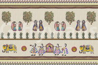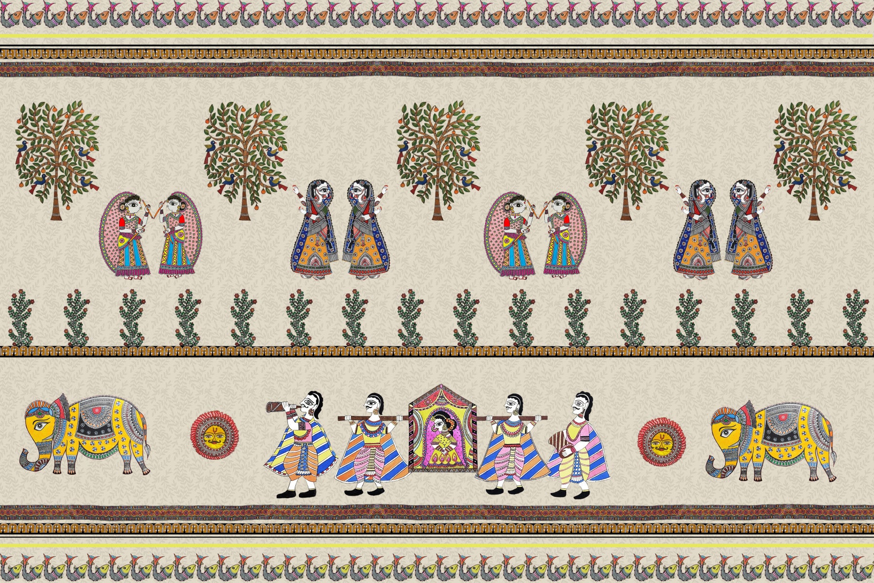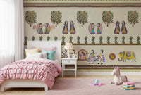 Adorn your walls with the regal charm of "Mithila Majesty". This artwork captures the essence of traditional Mithila art, depicting a vibrant procession steeped in culture and heritage. Majestic elephants, adorned with intricate patterns, stand guard alongside scenes of palanquins carried with reverence. Stylised figures engaged in dance and celebration are interspersed with trees bearing the bounty of nature, all rendered in a palette that echoes the warmth of the Indian sun. Delicate borders featuring stylised flora and fauna further enhance the visual storytelling. This wall covering transforms any space into a gallery, showcasing the enduring artistry and captivating narratives of the Mithila region. Invite a touch of timeless elegance and cultural richness into your living space with this extraordinary piece.