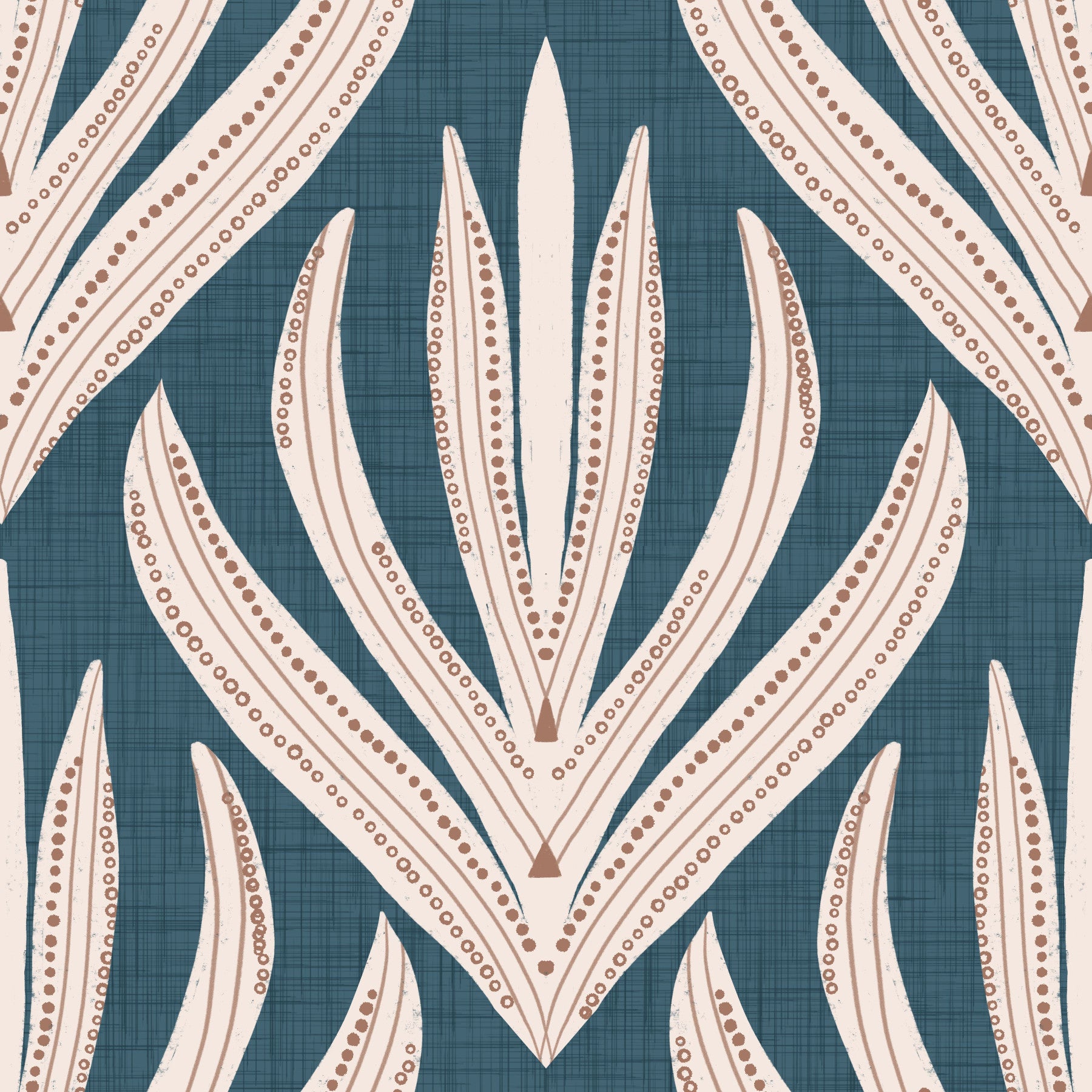 Modern Aztec Flora wallpaper showcasing large symmetrical leaf-inspired designs in cream and rust accents.