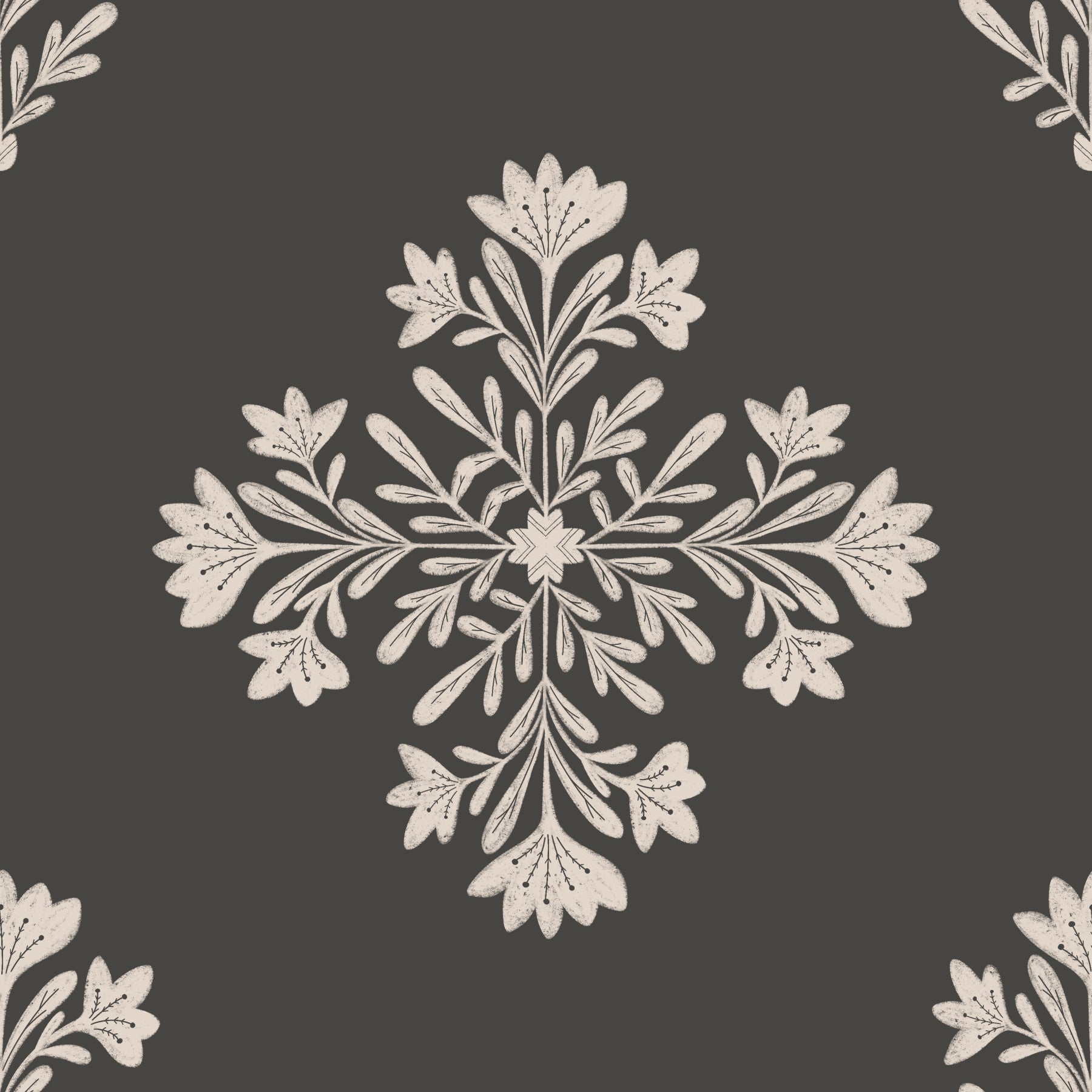 This wallpaper blends modern minimalist design with folk art influences. The repeating pattern features stylized floral motifs in a soft, off-white tone against a deep grey background. The textured finish adds depth and visual interest, while the simple yet elegant design creates a sense of calm and understated sophistication. Perfect for adding a touch of rustic charm to contemporary spaces. This versatile wallpaper will suit a variety of interior styles and rooms.