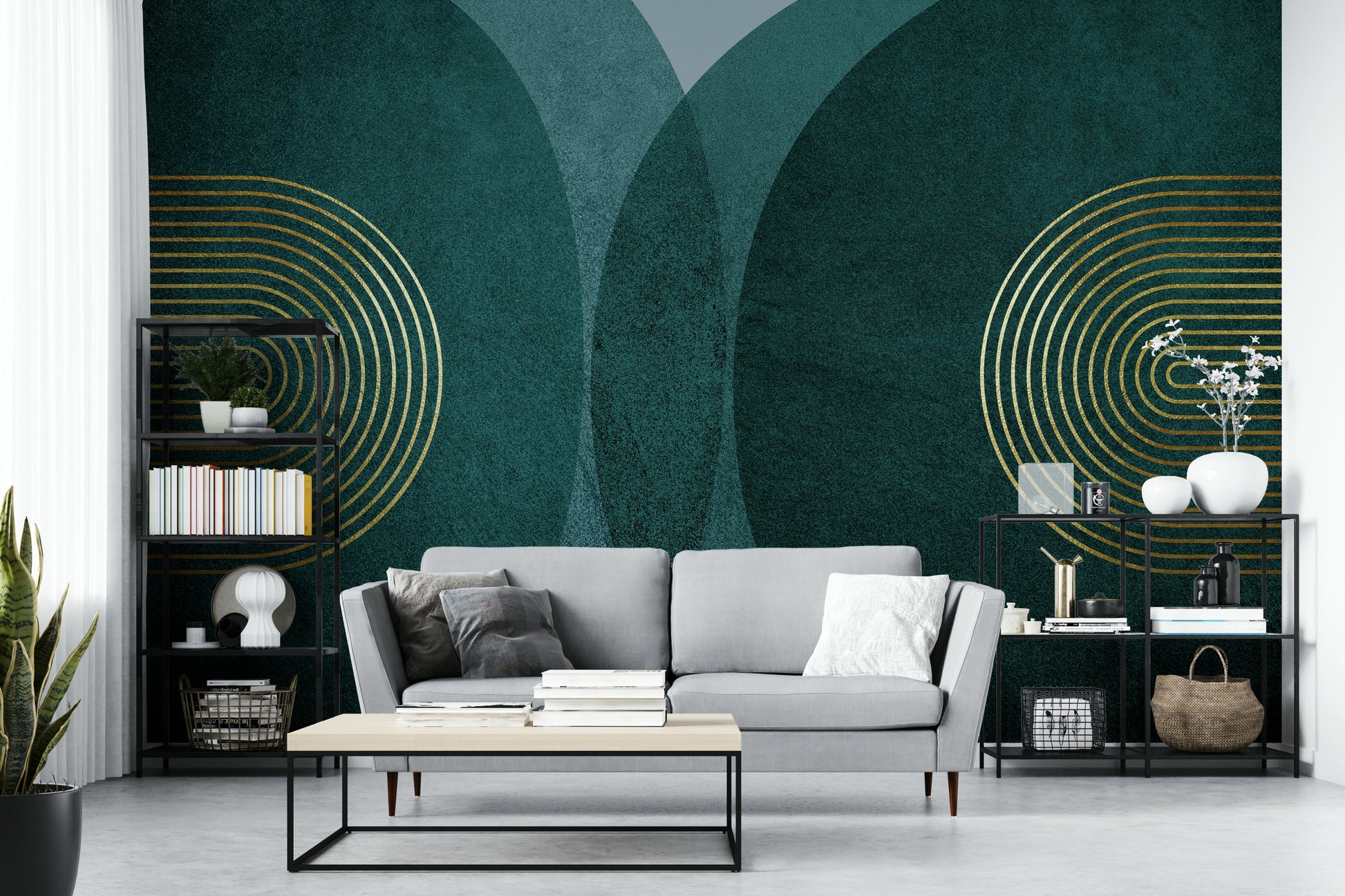 Embrace sophisticated serenity with this "Modern Mid Century in Teal" wallpaper. Deep teal textured circles, reminiscent of mid-century modern design, intersect against a soft grey backdrop. Elegant gold lines, arranged in graceful arcs, add a touch of luxury and geometric precision. The subtle interplay of textures and the rich color palette creates a calming yet stylish atmosphere, perfect for adding a touch of retro-chic to any room.