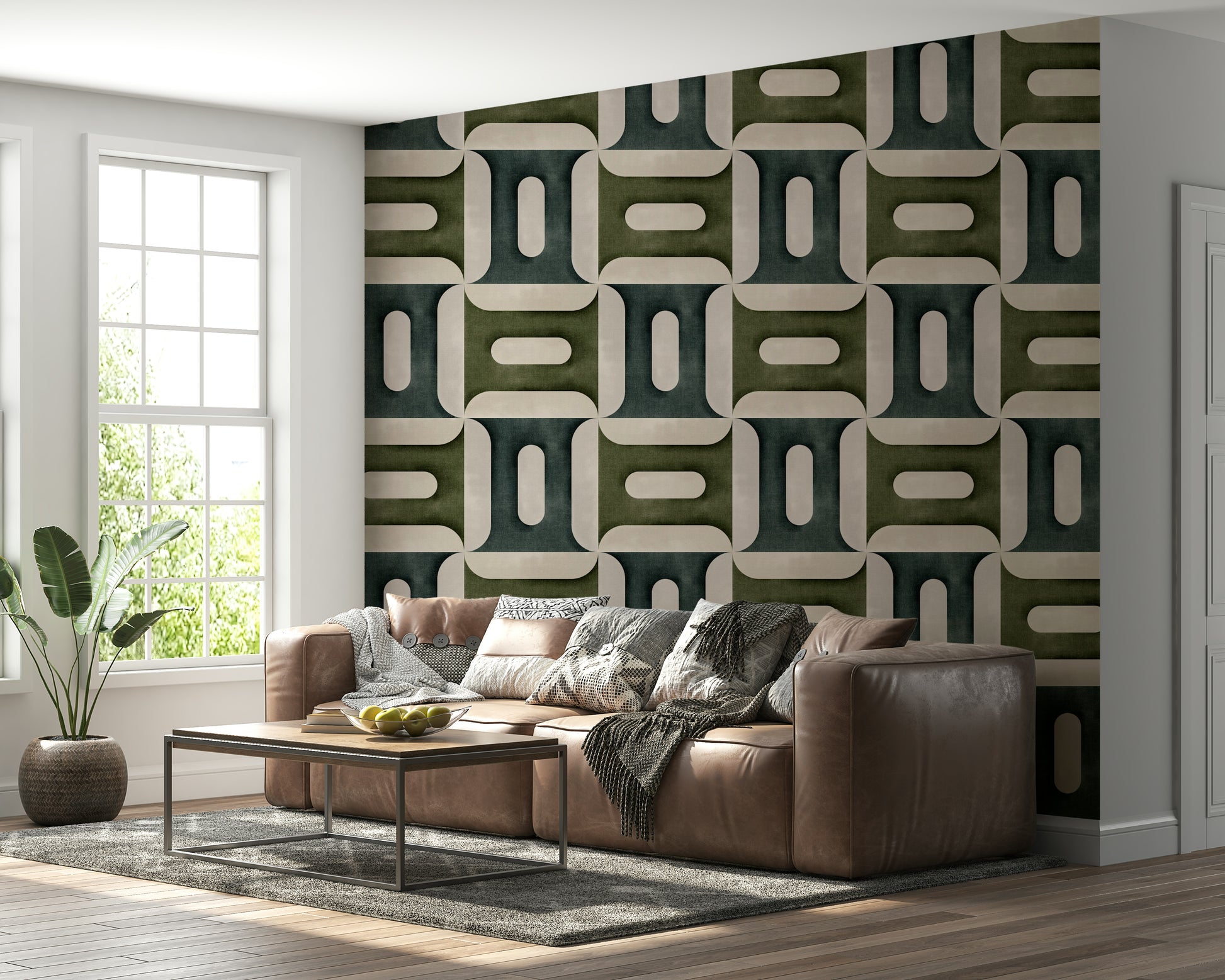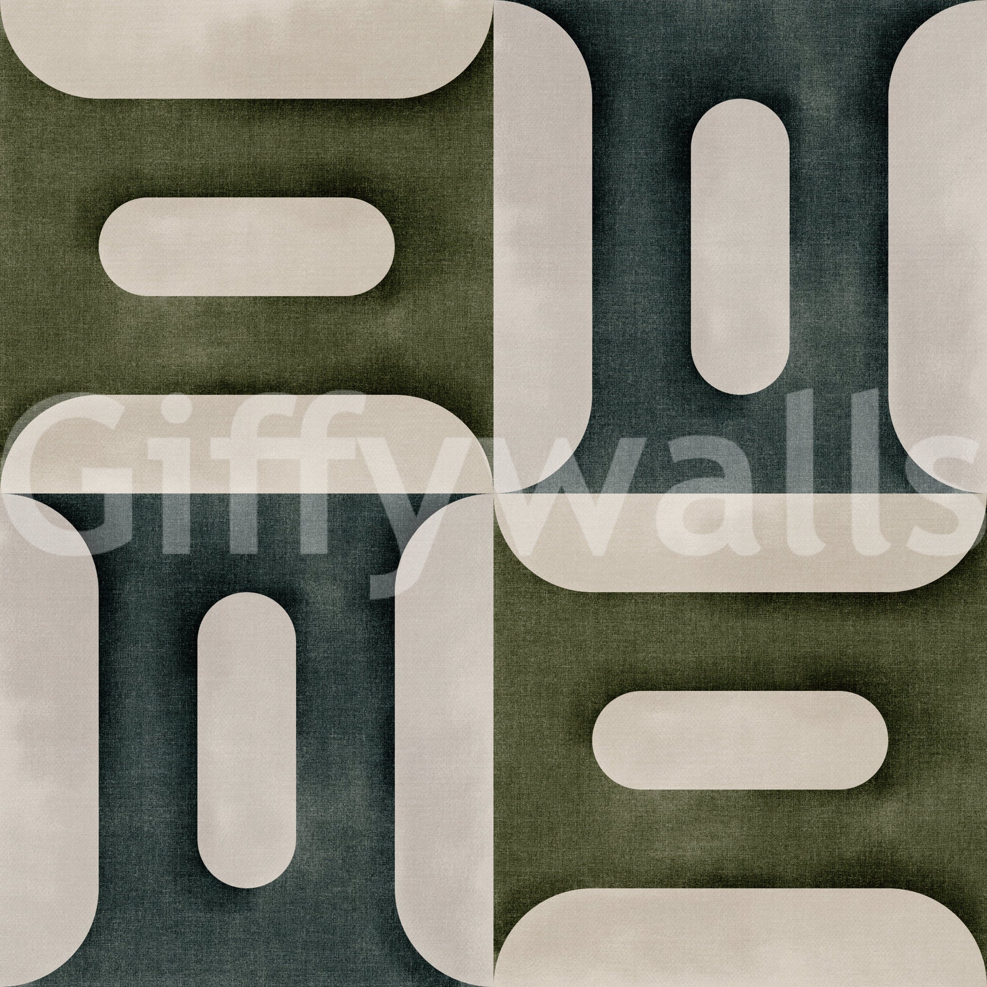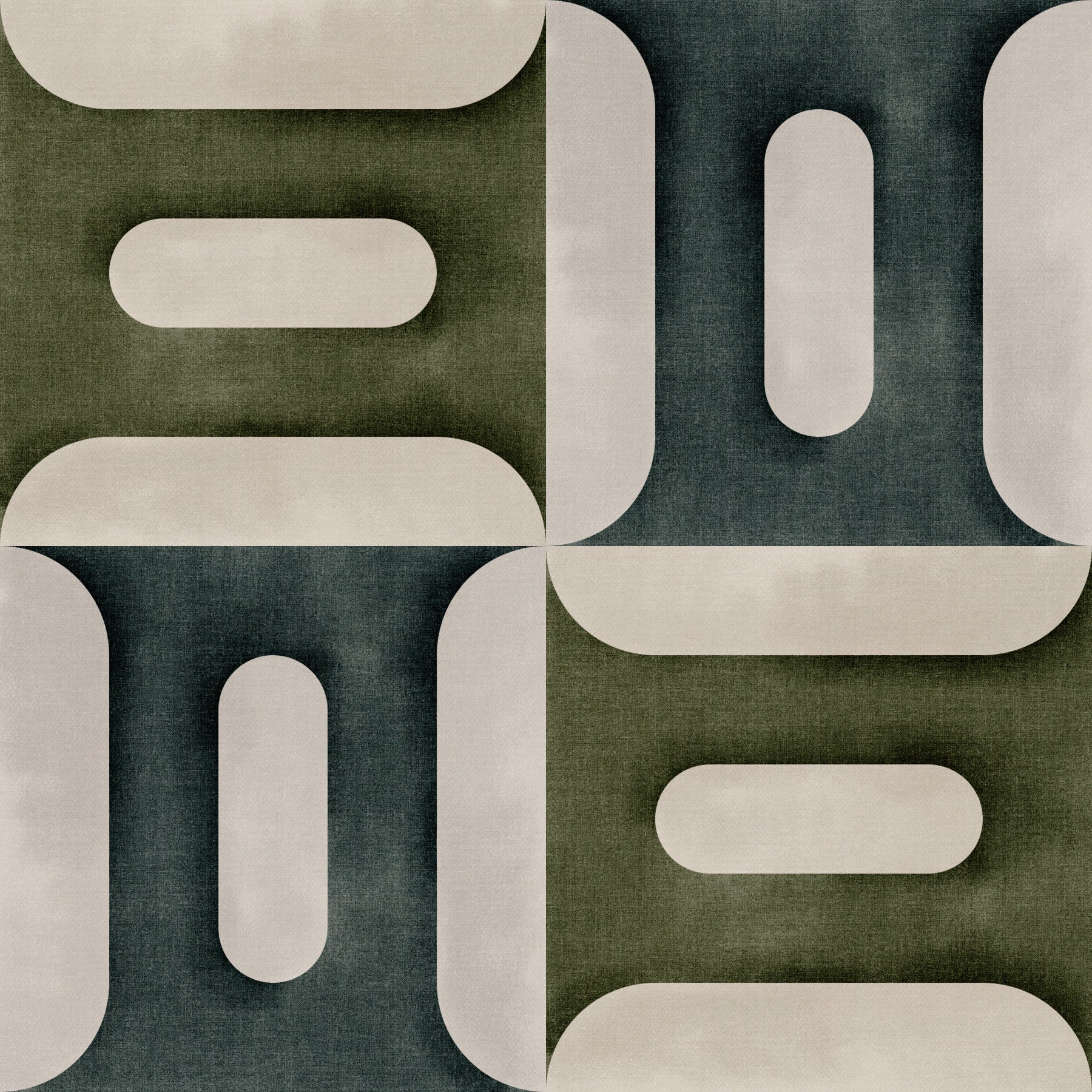 Embrace the serene stillness of winter with "Modern Textured Geometries Winter," a captivating wall covering that harmonises contemporary design with the cosy comfort of texture. The pattern features a sophisticated interplay of rounded geometric forms in muted, earthy tones like deep teal and calming sage green, reminiscent of frosted landscapes and evergreen boughs dusted with snow. Contrasting these are the soft, warm neutrals that evoke the feeling of a cosy winter cabin, creating a visual balance that is both striking and soothing.